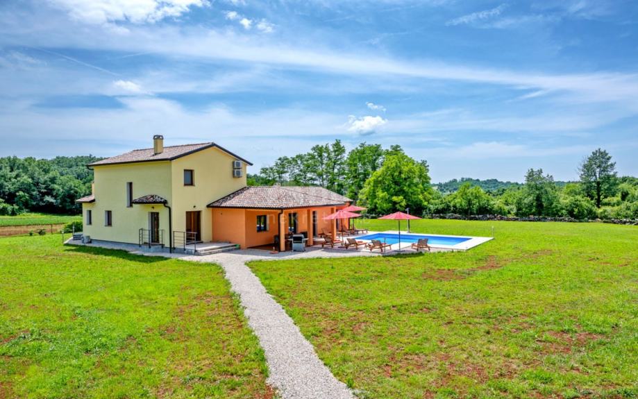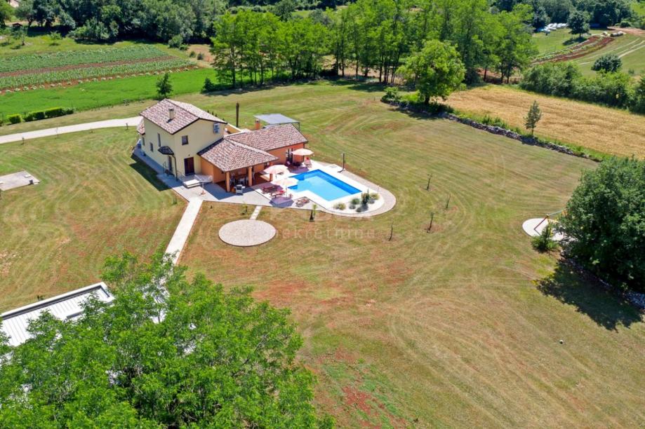 Gradić, nekoč obdana z obzidjem in stolpi, je danes kraj z zelo izrazitim šarmom, kjer se s ponosom izražata tradicija in zgodovina. Nahaja se nad zimzeleno Drago, katere lepote lahko uživamo z razgleda Tinjan pod starimi palmami. Občina Tinjan obsega površino 53,94 km2 in v njej je 8 naselij. V mirni vasici 8 km od Tinjana se nahaja ta očarljiva hiša na prostorni parceli 11500m2. Hiša velikosti 280m2 ima dve stanovanjski enoti in je urejena s kvalitetnim pohištvom. Notranjost je svetla in moderna. Eno enoto sestavljajo prostorna dnevna soba, jedilnica in odprta kuhinja z neposrednim dostopom na pokrito teraso 20m2 in bazen 50m2. V pritličju je ena dvoposteljna soba in ločena kopalnica. V prvem nadstropju sta dve udobni in prostorni spalnici, vsaka s svojo kopalnico in izhodom na teraso. Druga enota je stanovanje, ki ga sestavljajo kuhinja z jedilnico in dnevna soba, spalnica in kopalnica. Poleg vsega tega je na posestvu še en objekt, v sklopu katerega imamo še eno dvosobno stanovanje in garažo, bazen s teraso za sončenje, žar in otroško igrišče. Idealen kraj za sprostitev in počitek ali za družinsko življenje.