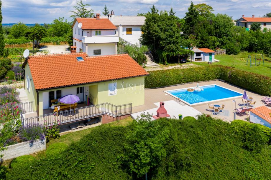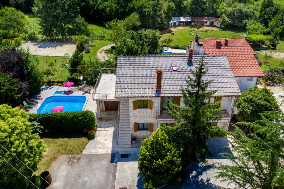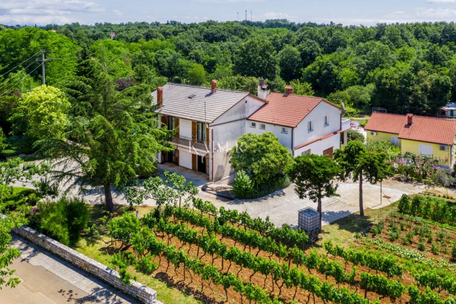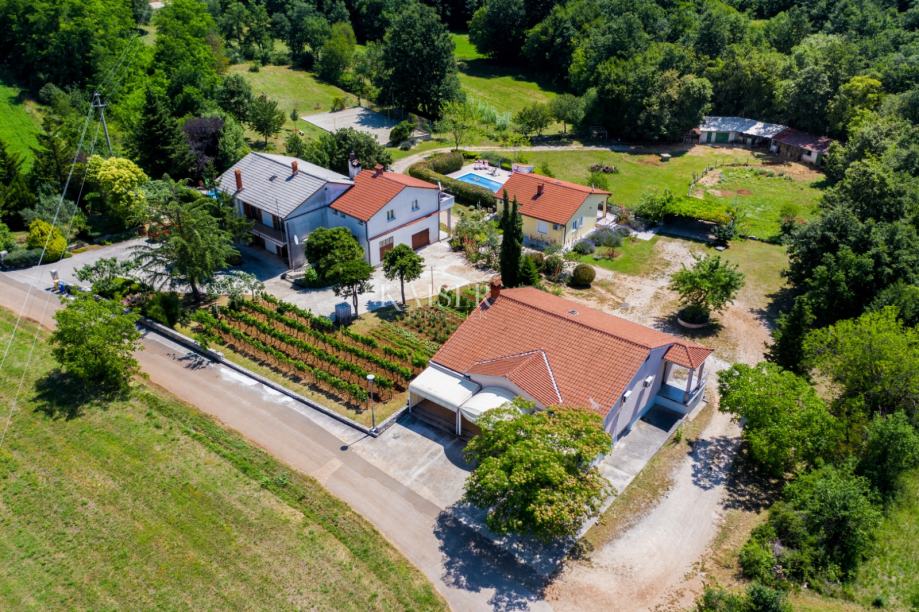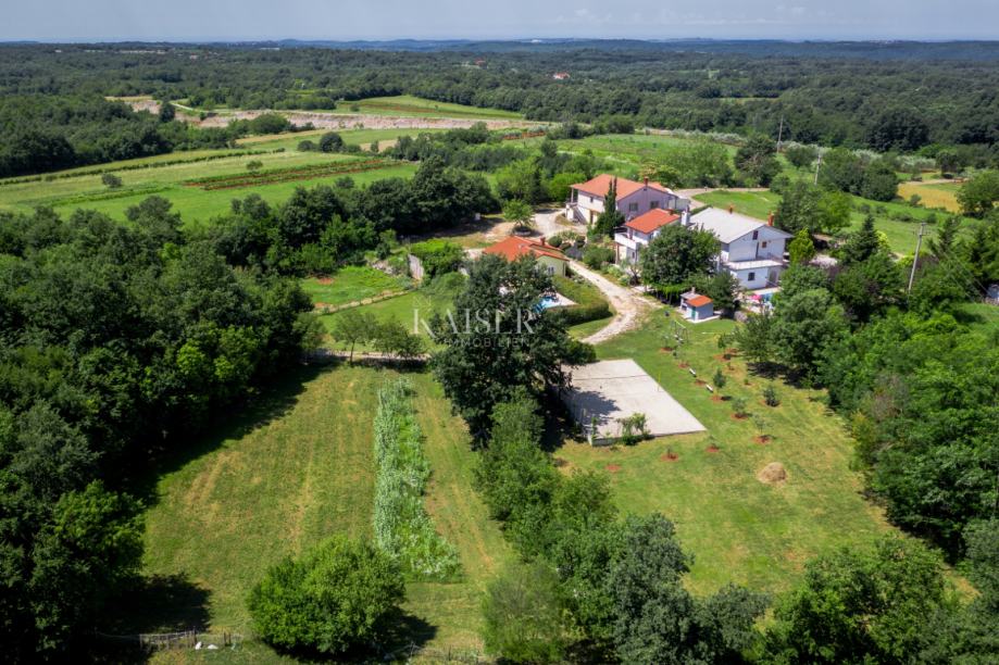 Kaiser Immobilien predstavlja kompleks družinskega posestva, ki ga sestavljata 2 hiši z bazeni in 1 poslovno - stanovanjski objekt, obdan z naravo; gozd in zelene površine. Razteza se na površini cca 10.000 m2, sestavljajo pa ga: 1. Samostojna hiša, dvonadstropna stavba cca 280m2 s 3 garažami (cca 83m2), Sestavljena je iz 3 stanovanj; - klet: konoba s kaminom (cca 36m2), kurilnica in shramba za drva (cca 10m2) - pritličje: stanovanje cca 112m2; kuhinja, jedilnica, dnevna soba, 3 spalnice, 2 kopalnici, klima, wi-fi, delno pokrita terasa. - 1. nadstropje: stanovanje cca 100m2; kuhinja, jedilnica, dnevna soba, 2 spalnici, 1 kopalnica, shramba, pokrit balkon, terasa, wi-fi. - 1. nadstropje: stanovanje cca 65m2; kuhinja, jedilnica, dnevna soba, 2 spalnici, 2 kopalnici, klima, terasa. Ob hiši je bazen površine 43 m2, globine 1,3 m, številna parkirna mesta, urejeni parki in okolica, vinograd (4 vrste trt, cca 387 m2), njivski vrt cca. 180 m2. 2. Samostojna hiša je enonadstropna stavba, površine cca 70m2, zgrajena leta 2008. - pritličje: kuhinja, jedilnica, dnevna soba, 2 spalnici, 2 kopalnici, shramba, pokrita terasa (cca 20m2), 2 klimatski napravi, wi-fi, žar. Ob hiši je bazen površine 8m x 5m, globine 1,3m, 2 pokriti parkirni mesti, urejen park in okolica, vodnjak (cisterna za pitno vodo) dimenzij 5m x 5m x 3m. Med 1. in 2. družinsko hišo je športno-rekreacijski prostor (ca. 600 m2); igrišče za odbojko na mivki, gugalnice, gugalnice in zidani žar, v nadaljevanju pa urejeno zemljišče. V dolini pod 2. družinsko hišo so bili zgrajeni objekti za domače živali, hlevi, garaže za stroje (cca 132m2) in prostor namenjen živalim (na posestvu živijo osel, gosi in kokoši). 3. Poslovno-stanovanjski objekt, površine cca 280m2, ki se nahaja na parceli 576m2 - klet: 140m2; odprt prostor, 1 wc, veliko parkirišče (možnost dovoza za tovorna vozila) - pritličje: cca 189m2; 3 sobe, hodnik, 1 wc, 3 kopalnice, kuhinja, velika pokrita terasa, 4 klime, veliko parkirišče. Objekt ima uporabno dovoljenje. Posestvo je prometno in zelo dobro prometno povezano (v bližini Istrskega ipsilona), v čudoviti zeleni pokrajini, mirnem kraju idealnem za večjo družino ali že pripravljenem kompleksu za najem (kategorizirani apartmaji z bazeni) s primernimi športno-rekreacijskimi objekti in lasten poslovni prostor, ki omogoča odprtje podjetja ali nadaljnji najem. Primerna je tudi za eko turizem. Lega: v samem središču istrskega polotoka; oddaljenost od morja - 20 km bližina Istrskega ipsilona - 3 km Pulj (letališče) - 39 km Rijeka - 72 km Zagreb - 230 km Ljubljana - 181 km Benetke - 261 km Dunaj - 565 km Budimpešta - 571 km Za dodatne informacije in oglede , se obrnite na nas z zaupanjem - Dean Luić, mobi: +385992140008, E-pošta: dean@kaiser-immobilien.hr