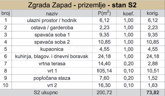 Kaiser Immobilien predstavlja: Luksuzno stanovanje v pritličju (S2) z zasebnim vrtom, Kaštel Sućurac Na izjemni lokaciji, v prvi vrsti do morja, se nahaja to čudovito, novo in moderno dvosobno stanovanje. Kot del ekskluzivnega stanovanjskega kompleksa to stanovanje v pritličju ponuja edinstveno mešanico razkošja, udobja in neposredne povezave z naravo, s čudovitim pogledom na morje. O PROJEKTU: To stanovanje je bilo skrbno zasnovano tako, da poudarja odprte, svetle prostore in brezhibno povezavo z naravnim okoljem. Velike terase in zasebni vrtovi ponujajo čudovit razgled na morje, visokokakovostni materiali in prefinjena arhitekturna zasnova pa zagotavljajo trajno vrednost. Kompleks je sestavljen iz manjših stavb s samo 8 stanovanji, kar zagotavlja zasebnost in ekskluzivnost. O STANOVANJU: Oznaka: Stavba Istok - Pritličje - Stanovanje S2 Skupna popravljena površina: 72,93 m² RAZPOREDITEV STANOVANJA: Vhodni prostor / hodnik: 6,12 m² Shramba / garderobna omara: 2,23 m² Spalnica 1: 9,35 m² Spalnica 2: 10,85 m² Kopalnica: 4,55 m² Kuhinja, jedilnica in dnevna soba: 24,18 m² Vrtna terasa: 14,40 m² (izračunano 2,88 m²) Vrt 1: 96,30 m² (izračunano 9,63 m²) Asfaltirana pot: 7,60 m² (izračunano 1,52 m²) Vrt 2: 16,30 m² (izračunano 1,63 m²) VRHUNSKA OPREMA IN UGODNOSTI: Lokacija prva vrsta ob morju: Neoviran pogled na morje in neposreden dostop do obale. Zasebni vrt in terasa: Prostoren zunanji prostor z vrtom in teraso, idealen za sprostitev in uživanje v mediteranskem vzdušju. Podzemna garaža: Garaža je z dvigalom povezana z vsemi nadstropji za maksimalno udobje. Visokokakovostni materiali: Vrhunski parket in keramika. Klimatska naprava: Večconska klimatska naprava. Aluminijasta drsna polkna: Za zaščito pred soncem in dodatno zasebnost. Talno ogrevanje: V kopalnici za dodatno udobje. Prilagodljivost: Možnost izbire zaključnih materialov med gradnjo. Koncept "na ključ": Stanovanje se prodaja popolnoma dokončano (brez pohištva). CENOVNE IN DAVČNE UGODNOSTI: DDV vključen v ceno: Brez dodatnih skritih stroškov. Brez davka na nepremičnine: Kupec je oproščen plačila davka na nepremičnine (3 %). Parkiranje: Možnost nakupa parkirnega mesta v garaži po ceni 20.000 € ali zunanjega parkirnega mesta po ceni 10.000 €. LOKACIJA: Kaštel Sućurac, ki se nahaja med Splitom in Trogirjem, ponuja popolno kombinacijo mirnega življenja ob morju in bližine vseh mestnih ugodnosti. Ta lokacija omogoča hiter dostop do letališča, avtoceste in vseh kulturnih in zgodovinskih znamenitosti regije. Ne zamudite priložnosti, da postanete lastnik te edinstvene nepremičnine na eni najbolj privlačnih lokacij na Jadranu! Provizija agencije za kupca znaša 3 % + DDV in se plača v primeru nakupa nepremičnine, ob sklenitvi prvega pravnega dejanja. Ogled nepremičnine je možen le ob predhodnem podpisu pogodbe o posredovanju v prometu z nepremičninami. Če si želite nepremičnino ogledati osebno, se obrnite na: Joška Bašića E-pošta: josko@kaiser-immobilien.hr Tel: +385-91-511-2993 http://kaiser-immobilien.hr/