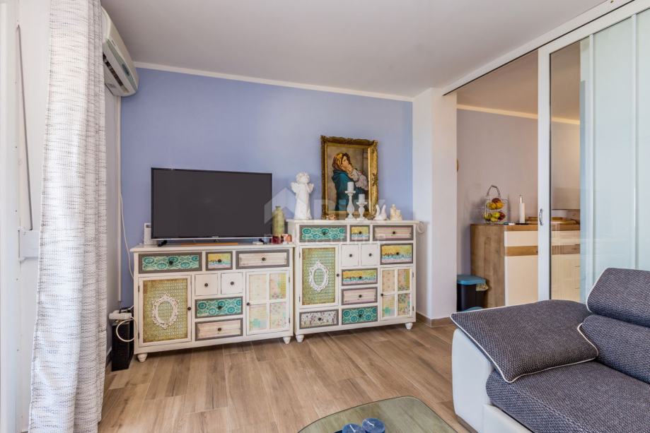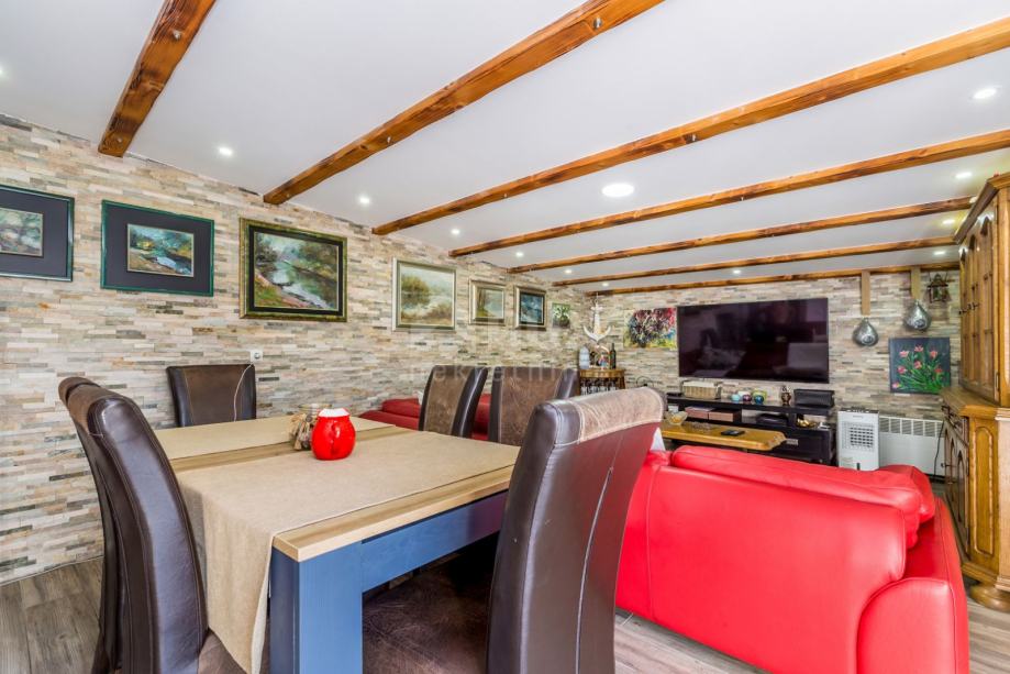 V pritličju se nahaja kuhinja z jedilnico, wc, dnevna soba z izhodom na pokrito teraso ter dodatna velika dnevna soba z lastnim vhodom, ki se uporablja za srečanja. Notranje stopnišče vodi v prvo nadstropje, kjer sta dve spalnici, od katerih ima ena izhod na teraso s panoramskim pogledom na morje in kopalnica. Hiša ima dve shrambi, zunanjo shrambo in veliko konobo. Na lepo urejenem vrtu, polnem sredozemskega rastlinja, se nahaja še ena pokrita terasa z jacuzzijem iz katere se prav tako lepo vidi morje in vrtna garnitura. Na vrtu je dovolj prostora za gradnjo bazena.