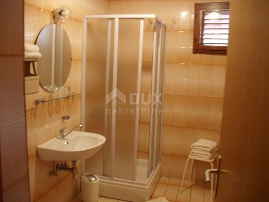 Hiša s 346m2 bivalne površine na parceli 523m2 sestoji iz kleti z garažo, shrambo in kurilnico, pritličja z dvema enosobnima stanovanjima in 1. nadstropje s prostornim dvosobnim stanovanjem. Notranje stopnišče povezuje garažo, glavna vhodna vrata in eno stanovanje v pritličju ter stanovanje v prvem nadstropju, drugo stanovanje v pritličju pa ima svoj vhod in ločeno garažo. Vsako stanovanje v pritličju sestoji iz hodnika, spalnice, kuhinje in dnevne sobe ter terase. Stanovanje v prvem nadstropju, ki zavzema celotno etažo, je sestavljeno iz hodnika, dveh spalnic, kuhinje s prostorno in osvetljeno jedilnico ter dnevne sobe z izhodom na veliko teraso s čudovitim pogledom na morje in zelenim pasom. Hiša je bila delno obnovljena leta 2013 vključno s streho. Mizarstvo je aluminij/les, medtem ko talno ogrevanje na solarno/električno in klimatsko napravo v vsaki stanovanjski enoti zagotavljata veliko udobje. Vrt v velikosti 317 m2 omogoča še tri parkirna mesta, medtem ko je vrt z mediteranskimi rastlinami edinstvena oaza za uživanje v toplih dneh. To nepremičnino krasi izjemna lokacija le 100m od morja z bližino vseh vsebin in je odlična naložba za turistični najem, pa tudi življenje v mirnem delu Krka.