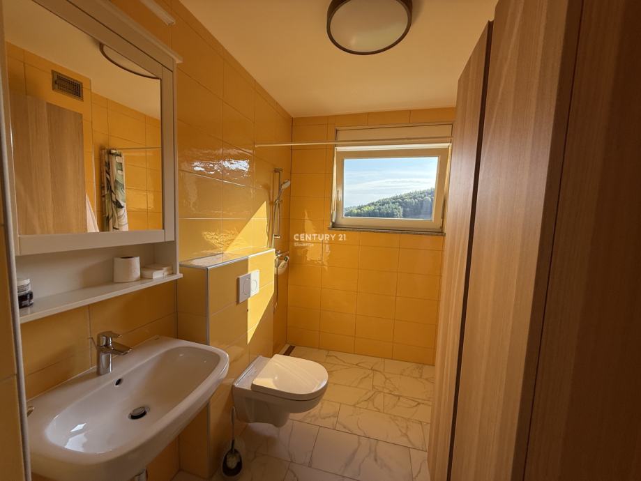 1. nadstropje: velik odprt prostor (kuhinja Dieter Knoll z aparati Miele, jedilnica, dnevna soba), kopalnica s tušem, spalnica, otroška soba