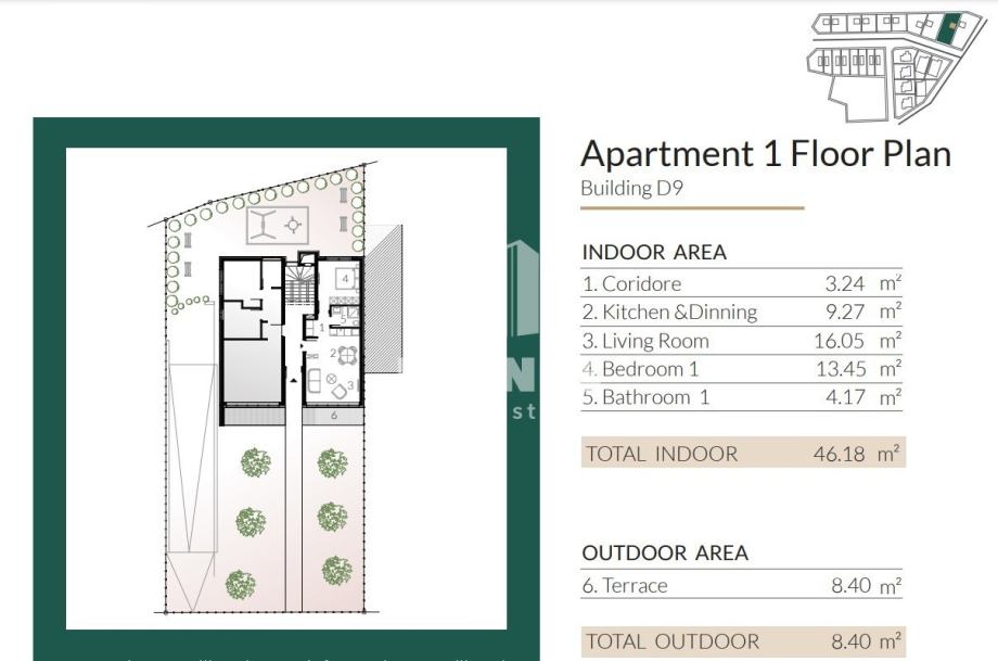 Celotna površina stana je 54,58 m2 ter se sastoji od hodnika, dnevnega bivanja s kuhinjo in blagovaonico odprtega tipa, 1 spalnice, kopalnice in terase.
