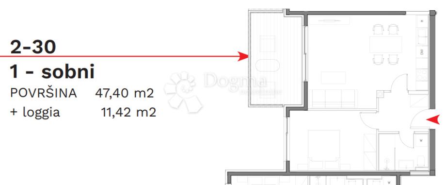 Sestoji iz predsobe, kopalnice, prostorne dnevne sobe s kuhinjo in jedilnico ter spalnice.