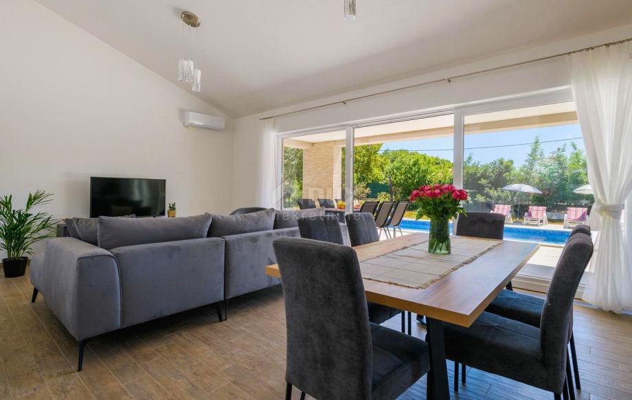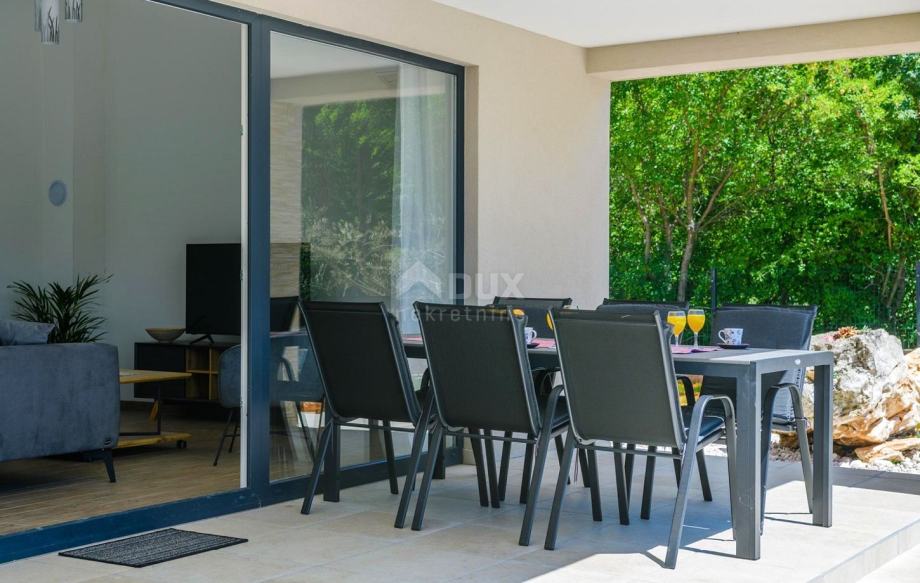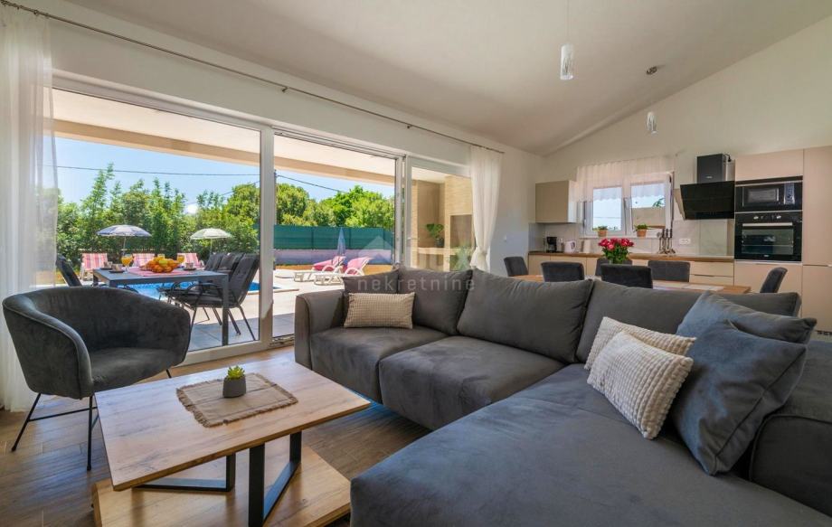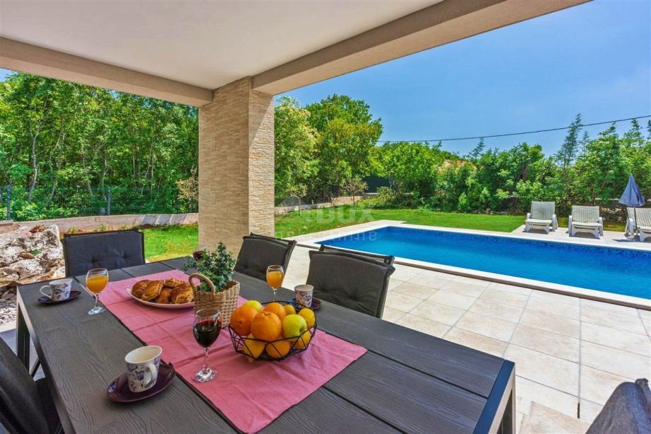 Na jugovzhodni obali Istre, kjer se zeleni griči srečajo z morjem, kjer se srečata narava in dediščina, se nahajata dve mesti podobne velikosti, a z različnimi, a med seboj dopolnjujočimi značaji - Labin in Rabac. Slikovito mesto Labin se dviga na hribu visokem 320 metrov, le pet kilometrov od belih prodnatih plaž v Rabcu. Prepleten z bogato zgodovino in rudarstvom, ki je zaznamovalo to regijo, je Labin, ki je bil za kratek čas razglašen za samostojno republiko, danes fascinantno mesto nasprotij; staro in novo, zgodovina in sedanjost, turizem in umetnost. Nedaleč od mesta Labin se prodaja elegantna novogradnja z bazenom. Nepremičnino odlikujejo ugodna lokacija, brezčasen arhitekturni videz in prostorska organizacija notranjosti. Elegantno enonadstropno hišo sestavljajo prostor odprtega koncepta, ki združuje dnevno sobo, jedilnico in kuhinjo z izhodom na pokrito teraso z odprtim kaminom, tri spalnice, tri kopalnice in shrambo. Ob hiši se na prostornem, ograjenem in urejenem vrtu nahaja 27 m² velik bazen s tlakovanim prostorom za sončenje. Glede na ugodno lokacijo je ta nepremičnina idealna priložnost za družinsko življenje ali kot naložba za najem v turistične namene.