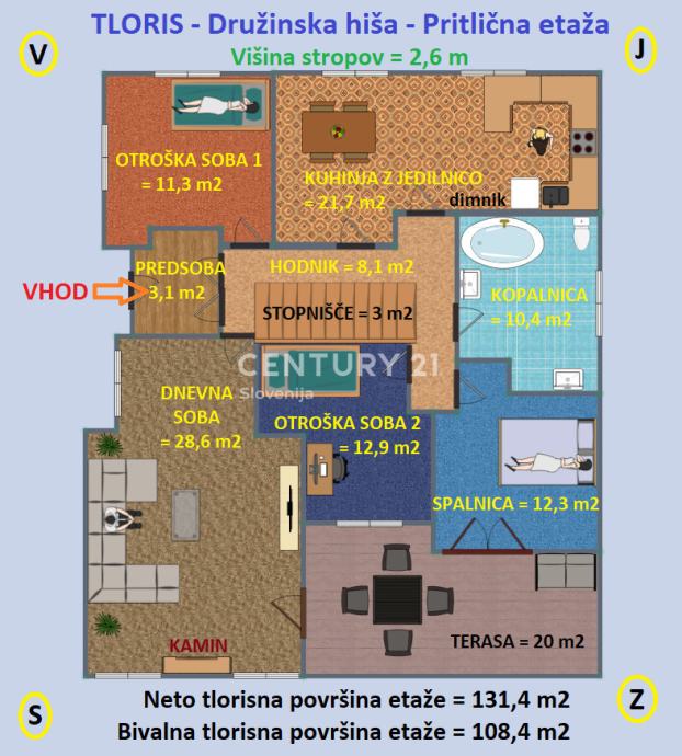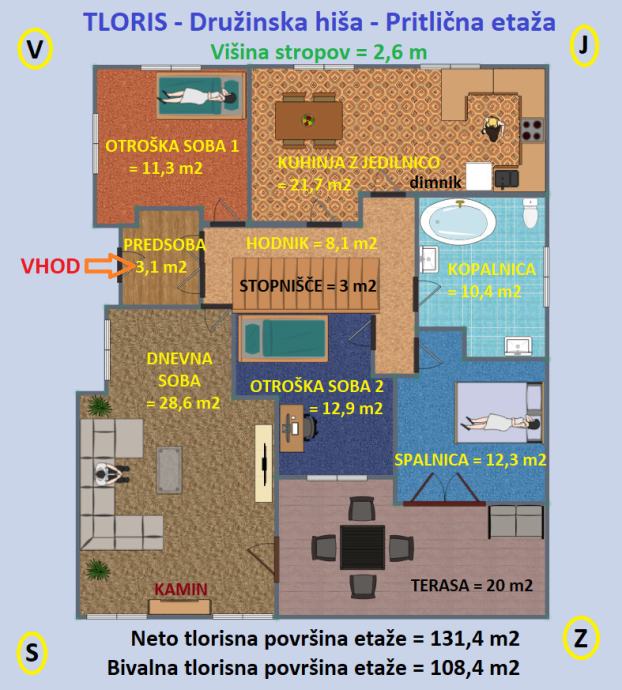 Pritlična etaža (neto tlorisna površina: 131,4 m2; višina stropov = 2,6 m): predsoba (3,1 m2), hodnik (8,1 m2), notranje, betonsko povezovalno stopnišče (3 m2), otroška soba 1 (11,3 m2), kuhinja z jedilnico (21,7 m2), kopalnica (10,4 m2), otroška soba 2 (12,9 m2) ter spalnica (12,3 m2) in dnevna soba (28,6 m2), oba prostora z izhodom na 20 m2 veliko teraso.