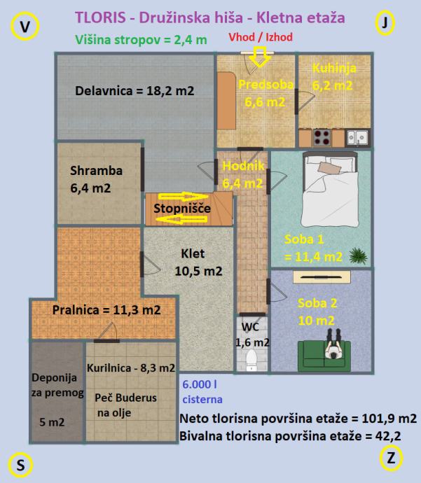 Kletna etaža (neto tlorisna površina: 101,9 m2; višina storpov = 2,4 m): predsoba (6,6 m2), hodnik (6,4 m2), kuhinja (6,2 m2), soba 1 (11,4 m2), soba 2 (10 m2), wc (1,6 m2), shramba (6,4 m2), delavnica (18,2 m2), pralnica (11,3 m2), klet (10,5 m2), deponija za premog (5 m2) in kurilnica (8,3 m2).