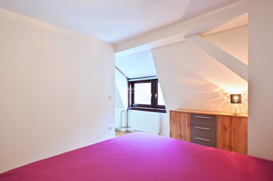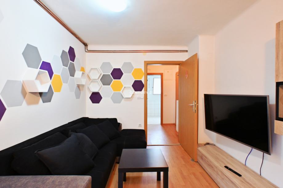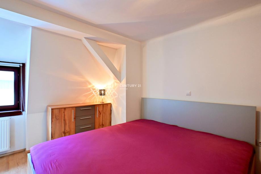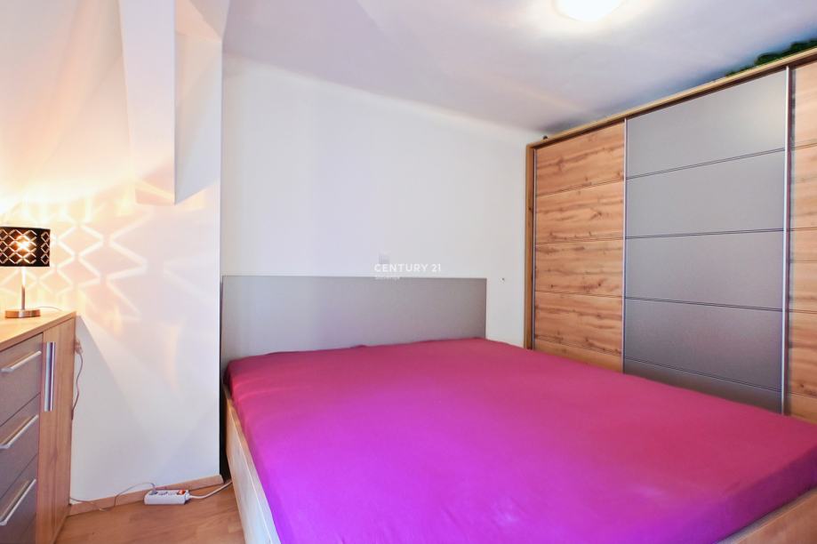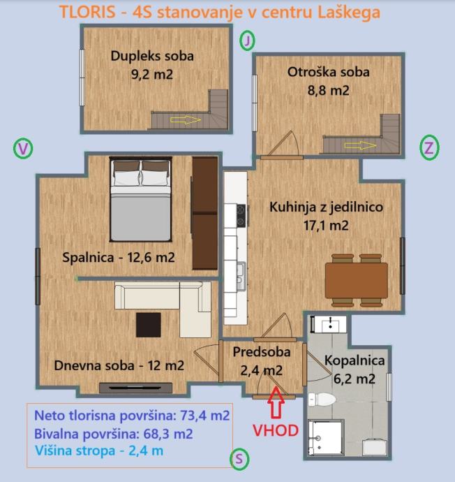 Prostori: predsoba (2,4 m2), kuhinja z jedilnico (17,1 m2), spalnica (12,6 m2), dnevna soba (12 m2), kopalnica (6,2 m2), otroška soba (8,8 m2) in dupleks »dodatna« soba (9,2 m2). Višina stropov znaša 2,43 m. Stanovanju pripada še 5,1 m2 velika klet. Stanovanje je funkcionalno, dobro izkoriščeno in primerno tako za družino kot za par ali posameznika, ki potrebuje več prostora.