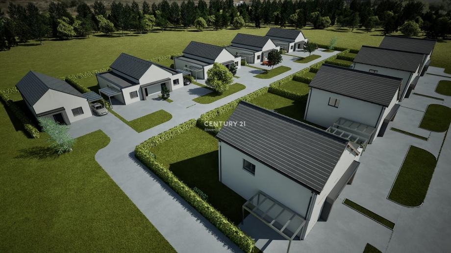 Oglas vključuje vizualizacijo zunanjosti postavitve hiš in tloris, ki prikazujeta razporeditev enot ter možne ureditve prostora.