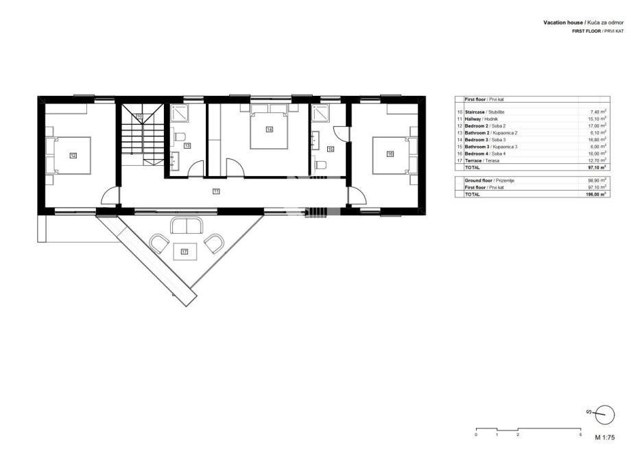 V prvem nadstropju so še tri spalnice z dvema kopalnicama in skupno teraso.