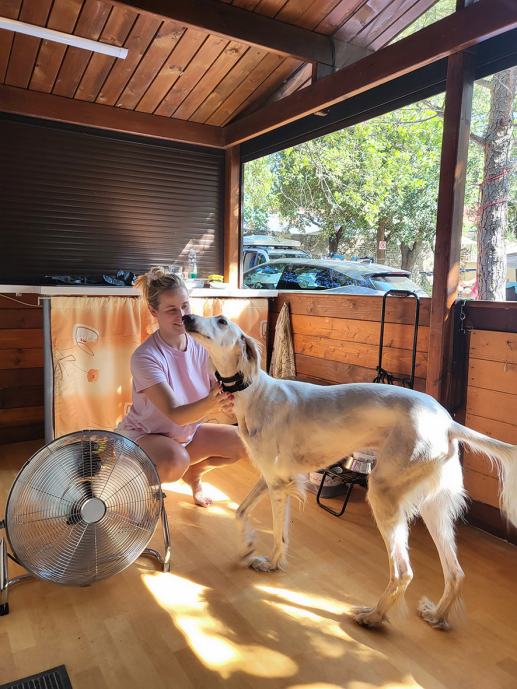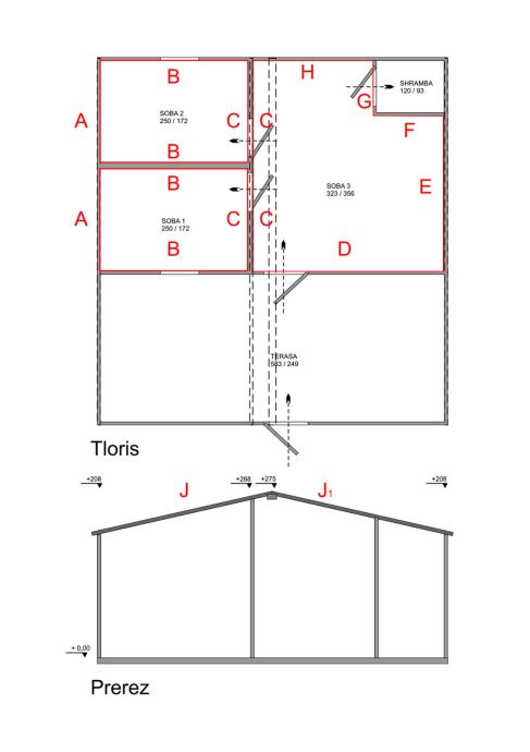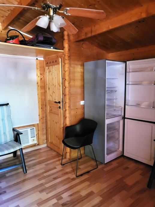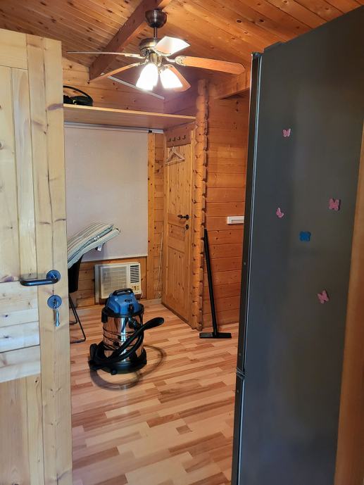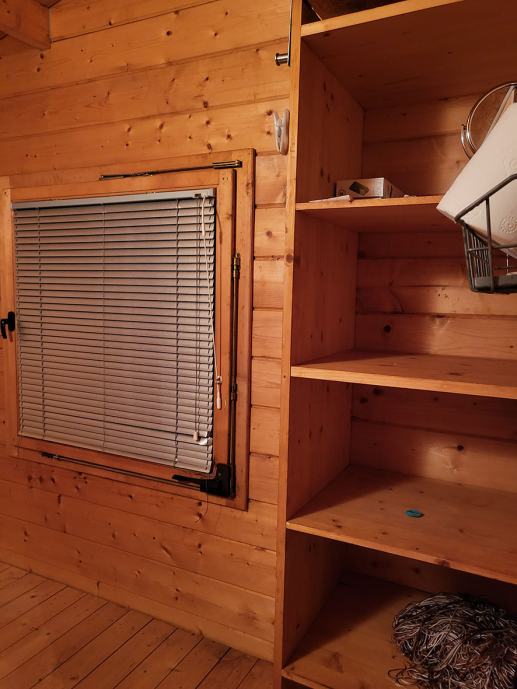 Velikost hiške je 36 m2 (6 x 6 m). Ima dve spalnici, v vsaki sta dve ležišči z vzmetnicami, en večji skupni prostor in shrambo. Na terasi velikosti 15 m2 (6 x 2,5 m) je opremljena letna kuhinja s plinskim štedilnikom in veliko jedilno mizo. V hiški je klima, velik hladilnik z zamrzovalnikom, gasilni aparat in sesalec za prah in listje.