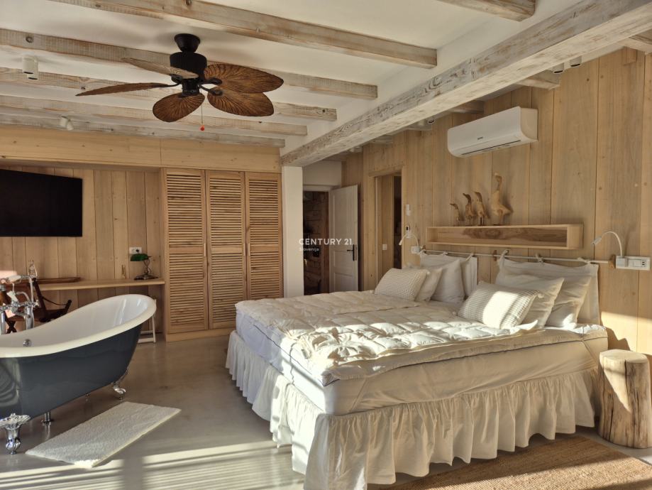 Notranjost vile vključuje popolnoma opremljeno kuhinjo z aparati, dnevno sobo, štiri spalnice s kopalnicami, ložo za posedanje v vseh letnih časih, balkon, vinsko klet, kotiček za ljubitelje ribolova, muharjenja...