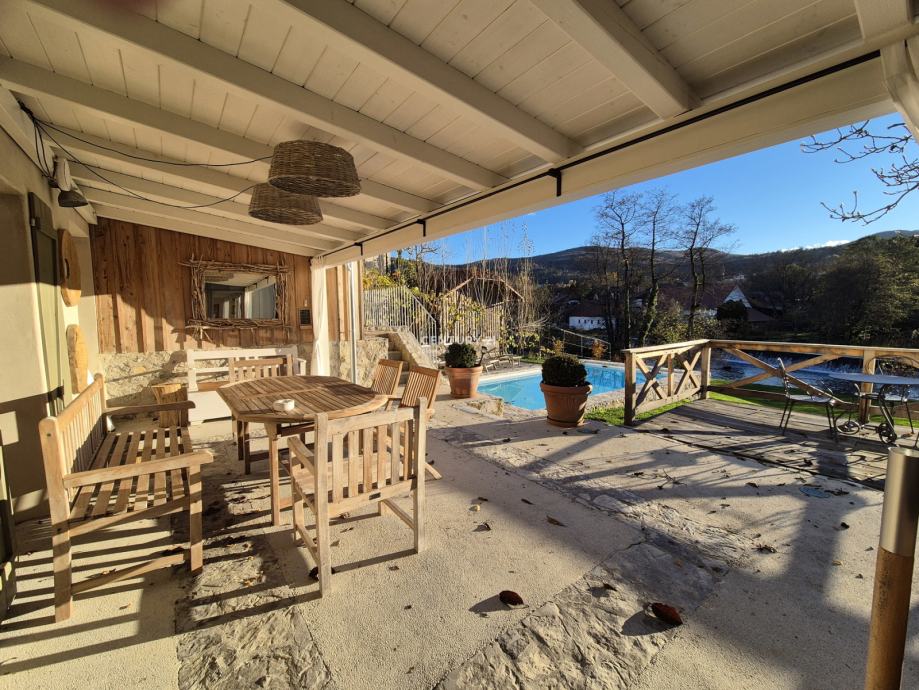 Posebna dodana vrednost posestva je vrtni paviljon uporabne površine 28m 2, kjer je krasen prostor za druženje. Poleti je lahko povsem odprt, pozimi pa zaprt. Savna poskrbi za prijetno sprostitev, vabi pa tudi bazen, kjer lahko plavate s pogledom na slap reke Krke.
