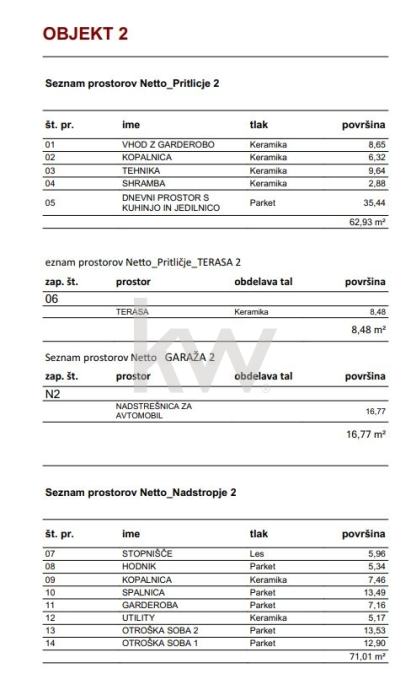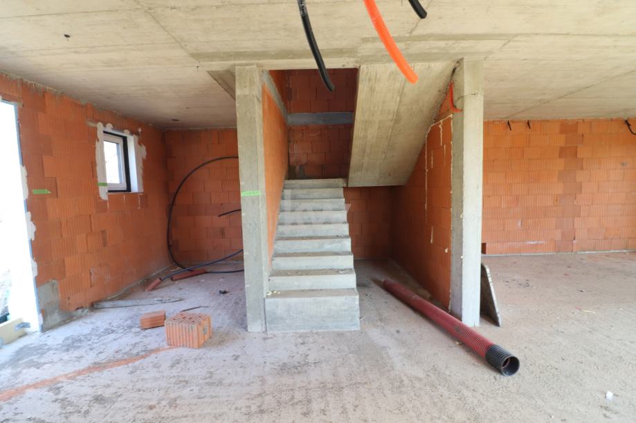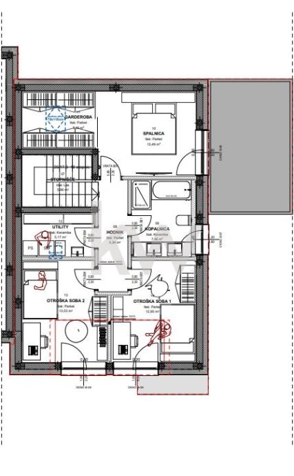 Nadstropje zajema: stopnišče 5,96m2, hodnik 5,34m2, kopalnica 7,46m2, spalnica 13,49m2, garderoba 7,16m2, utility 5,17m2, otroška soba ena 13,53m2, otroška soba dva 12,90m2, terasa v velikosti 8,48m2, SKUPAJ POVRŠINE: 142,42m2. TRATE OZIROMA ZELENICE JE V VELIKOSTI 80m2.