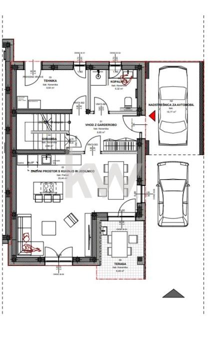 Pritličje zajema: vhod v garderobo 8,65m2, tehnična soba 7,64m2, kopalnica 6,32m2, dnevni prostor 35,44m2, shramba 2,88m2
