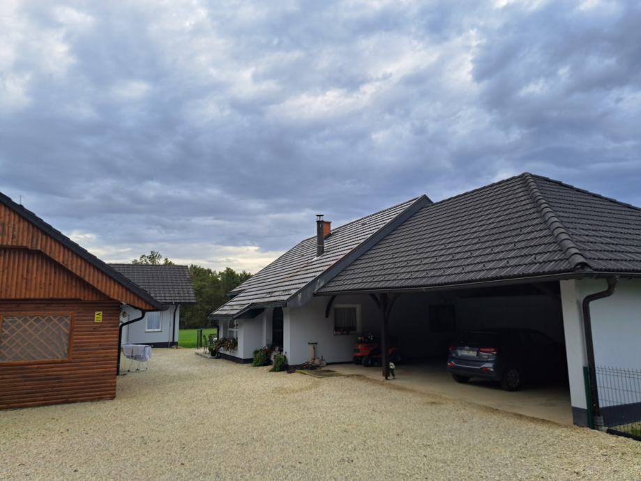 Na mirni lokaciji, 10 min od avtoceste (Brežice), se nahaja prostorna in skrbno vzdrževana samostojna hiša, obdana z naravo in izjemno zasebnostjo. Hiša, zgrajena leta 1990 in obnovljena 2010 se nahaja na veliki parceli velikosti v velikosti 4.400 m². Parcela vključuje pokrit prostor za parkiranje (80m2), delavnico, v kateri se je izvajala storitev šiviljstva (250m2), ter večja vrtna lopa na velikem travniku. Parcela je lepo urejena in nudi vse pogoje za mirno bivanje v objemu narave.