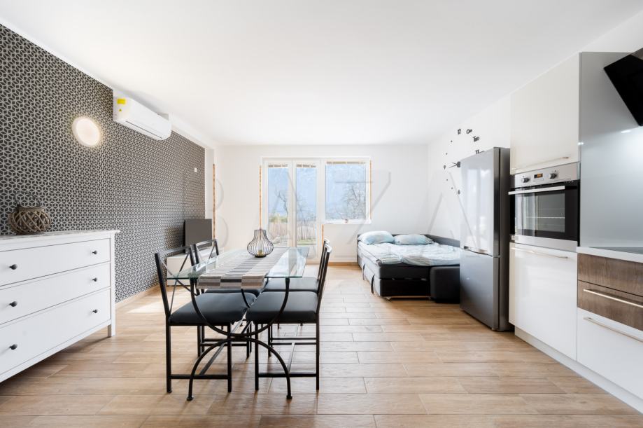 V pritličju se nahaja čudovito opremljena garsonjera (J lega); osrednji prostor obsega bivalni del z raztegljivim kavčem, polno opremljeno kuhinjo ter kopalnico s tušem. Ogrevanje na klimo.