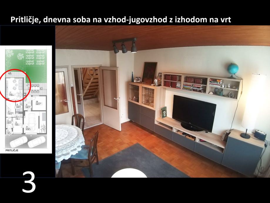 Prvotna končna vrstna hiša je bila v osemdesetih povečana s prizidkom. Spredaj proti ulici sta dve parkirni mesti + eno dodatno v garaži. Za vhodom je garderobni prostor, wc, stopnišče, kuhinja in dnevni prostor z dostopom na vrt. Iz garderobe je prehod v garažo, ki ima ločen prostor za shranjevanje orodja, koles in športnih pripomočkov. Tu je prehod v kurilnico, ki je hkrati dostop do velike shrambe in atrija proti vrtu. V nadstropju so štiri sobe, ki imajo vse dostop na balkonske niše. V nadstropju sta dve kopalnici (večja s kopalno kadjo in manjša z wc in tušem).