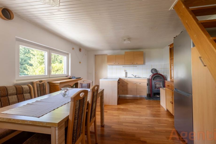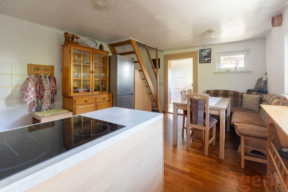• Pritličje: predprostor, osrednji bivalni prostor s kuhinjo in jedilnico, popolnoma prenovljena kopalnica (2023) s tuš kabino, dostop do mansarde.