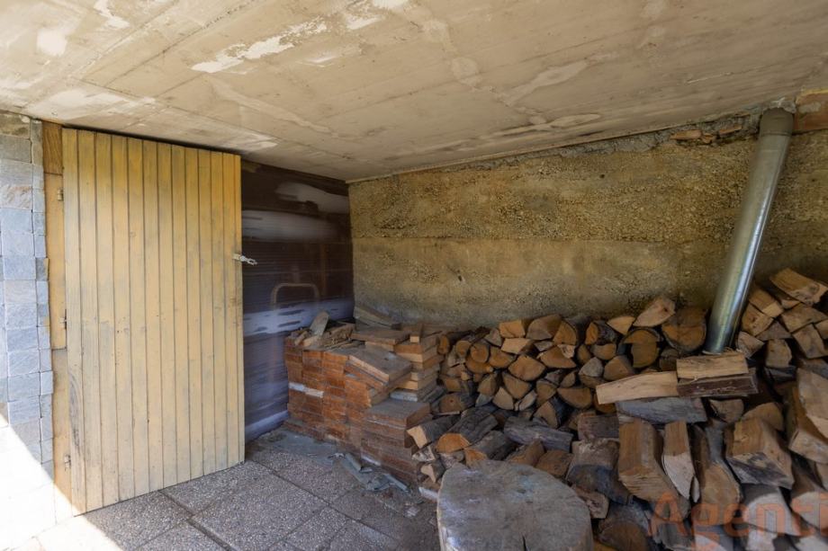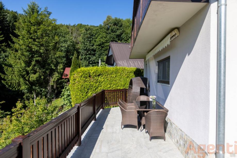 Parcela je v celoti ograjena in skrbno urejena. Ob hiši se nahaja prostor za parkiranje, lepo urejena terasa s tendo, pod njo pa odprt kletni prostor, ki služi kot drvarnica in dodatna shramba.