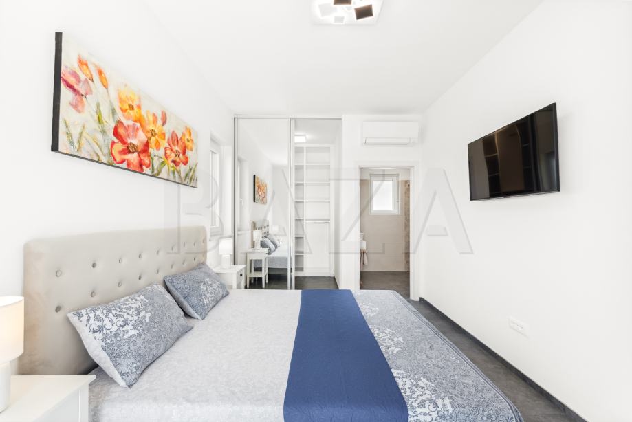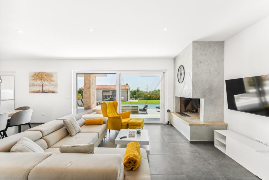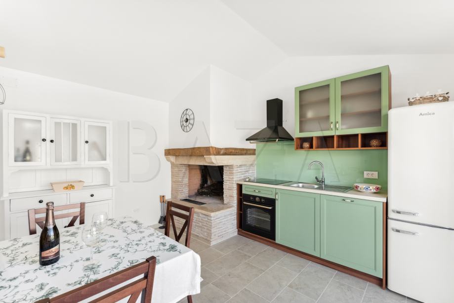 V pritličju vile se nahaja ena od treh spalnic, medtem ko sta preostali dve spalnici v nadstropju, vsaka s svojo kopalnico. Svetel in prostoren dnevni prostor povezuje moderno odprto kuhinjo, jedilnico in dnevno sobo s kaminom ter omogoča neposreden izhod na veliko teraso s panoramskim razgledom na morje. Poleg glavne kuhinje so v vili tri dodatne kuhinje: ena v pomožnem objektu, druga na pokriti terasi in tretja na vrtu, kar omogoča udobno pripravo obrokov med druženji in poletnimi kosili na prostem.