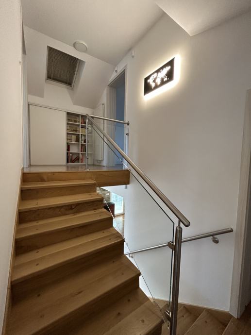 V različne etaže hiše se prehaja po osrednjem obnovljenem stopnišču iz masivnega hrastovega lesa.