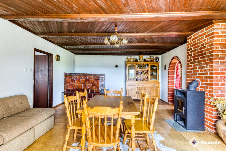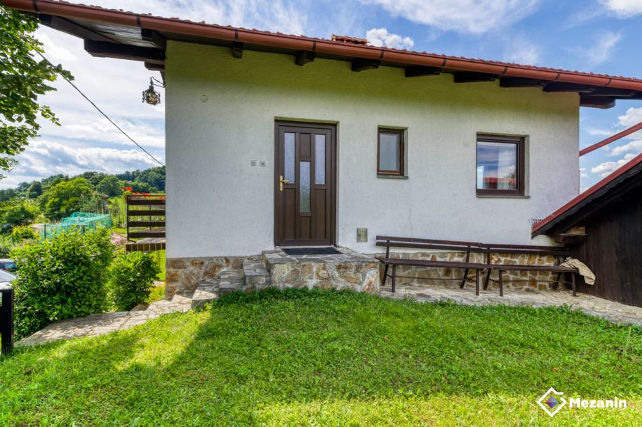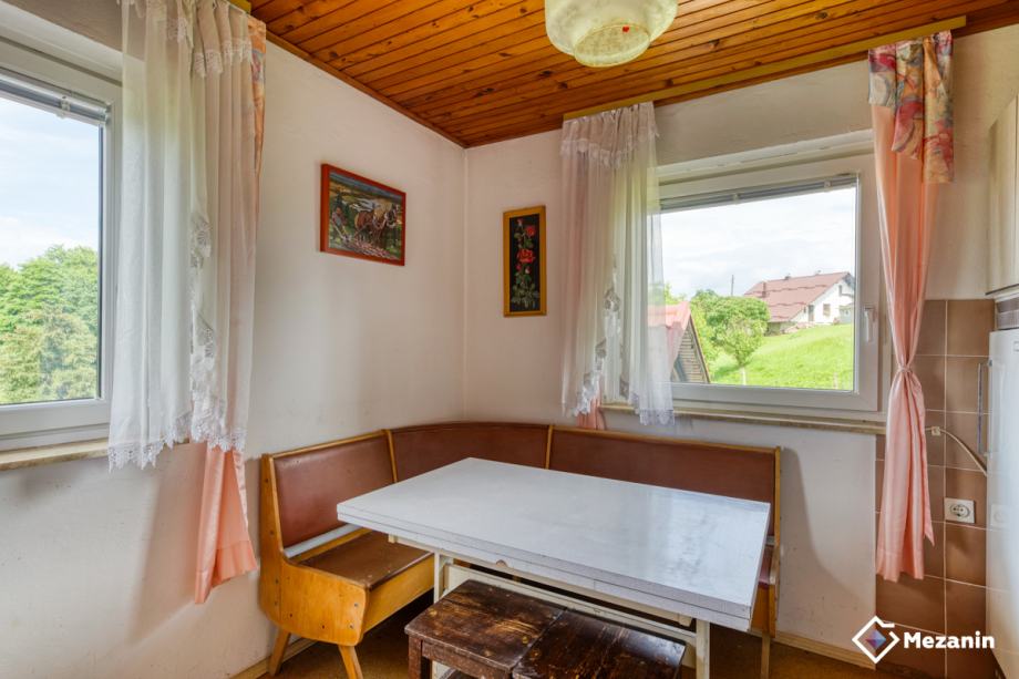 Glavni vhod, predprostor, manjša kopalnica s tušem in sanitarijami, iz predprostora je dostop do večje dnevne sobe in jedilnice, kjer se nahaja krušna peč na trdo gorivo in litozelezna kaminska peč, s katerima se lahko ogreva celotno pritličje. Iz dnevnega prostora je prehod na balkon, v manjšo kuhinjo in v spalnico.