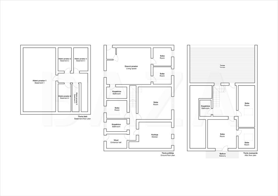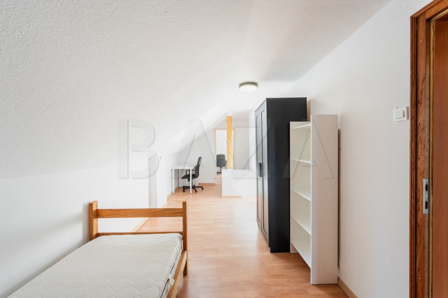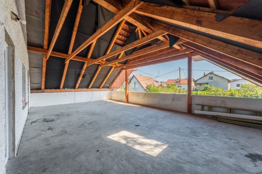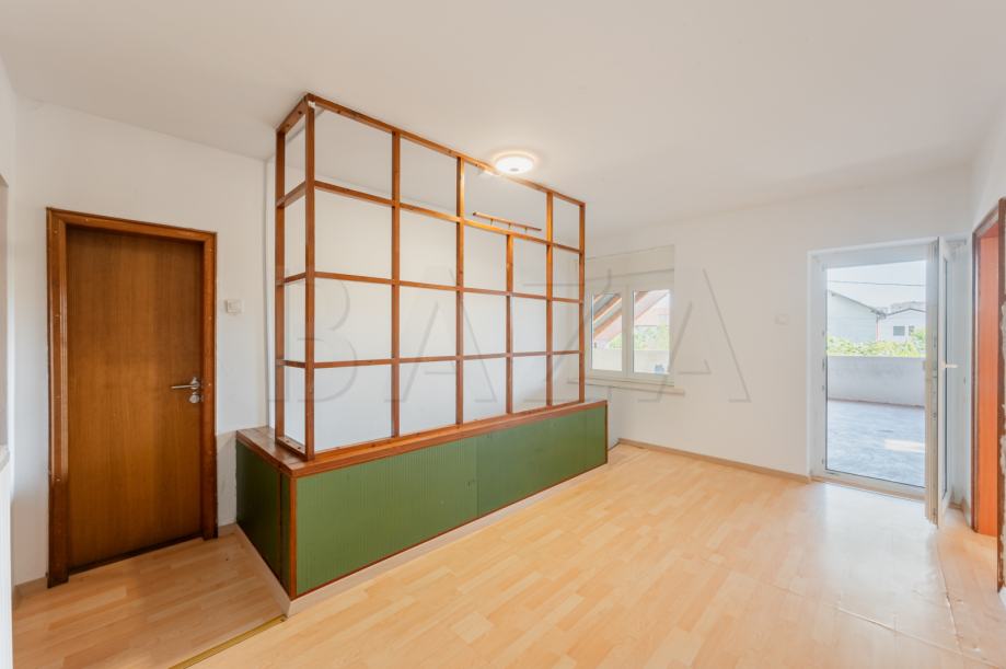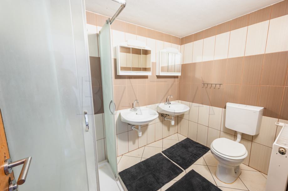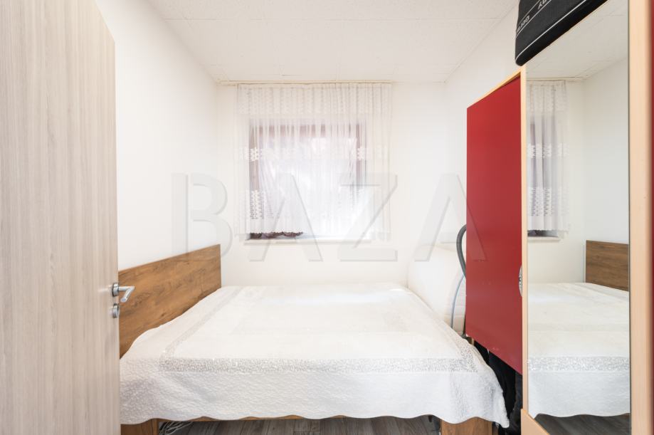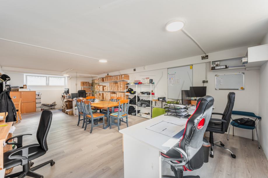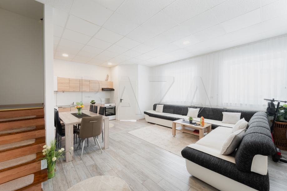 Stanovanjski objekt etažnosti K + P + 1 + M obsega dve stanovanji; stanovanje v izmeri 126,50 m2 in stanovanje (ločeno s svojim vhodom) v izmeri 54,80 m2, kletni prostor v obsegu 76,70 m2 ter teraso v velikosti 60,60 m2. Tloris zajema predprostor, kjer se nahaja stopnišče, ki vodi do kletnih prostorov ter do stanovanjskega dela nepremičnine. V stanovanjskem delu nepremičnine se nahaja večja kuhinja z bivalnim prostorom, večji spalni prostor, manjši spalni prostor s samostojno posteljo ter toaletni prostor s pralnico. Mansarda obsega dva večja spalna prostora, kopalnico ter večjo teraso, ki se lahko v prihodnosti spremeni v dodatne bivalne površine. V kletnem prostoru se nahaja prostor s toplotno črpalko, večja pisarna, čajna kuhinja, ločena manjša pisarna ter shramba/manjše skladišče. Vsi kletni prostori imajo okna, ogrevanje je dodatno urejeno s klimatsko napravo. Na zadnji strani stavbe se nahaja ločen vhod do samostojnega in v celoti opremljenega stanovanja, ki obsega kuhinjo z dnevnim prostorom, kopalnico ter spalni prostor.