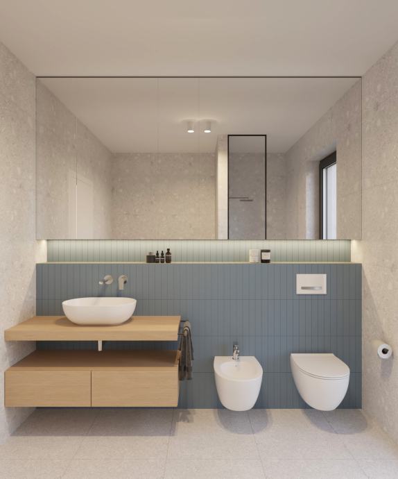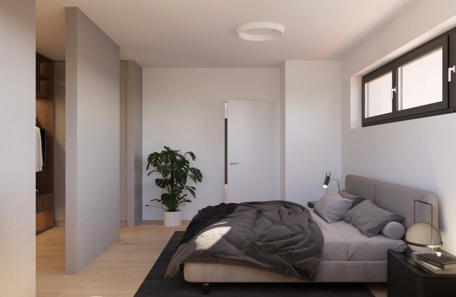 Nadstropje: hodnik, glavna spalnica z garderobno sobo, kopalnica ter dve dodatni sobi z izhodom na balkon.