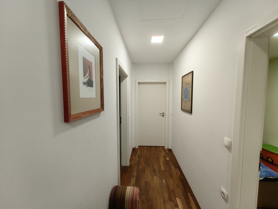 Razporeditev: PRITLIČJE: predprostor, osrednji prostor z izhodom na pokrito teraso (dnevna soba, kuhinja in jedilnica), kabinet, stranišče in utility; 1. NADSTROPJE: hodnik, 3 x soba, 2 x garderobna soba in kopalnica s straniščem