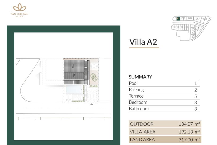 Prodamo vilo etažnosti P+1 s skupno površino 222,97 m2. Pritličje obsega hodnik, dnevno soba z odprto kuhinjo in jedilnico, kopalnico, utility in teraso z zunanjim bazenom. V prvem nadstropju so tri spalnice z izhodom na lastno teraso ter dve kopalnici. Vili pripadata dve parkirni mesti v skupni velikosti 30 m2.