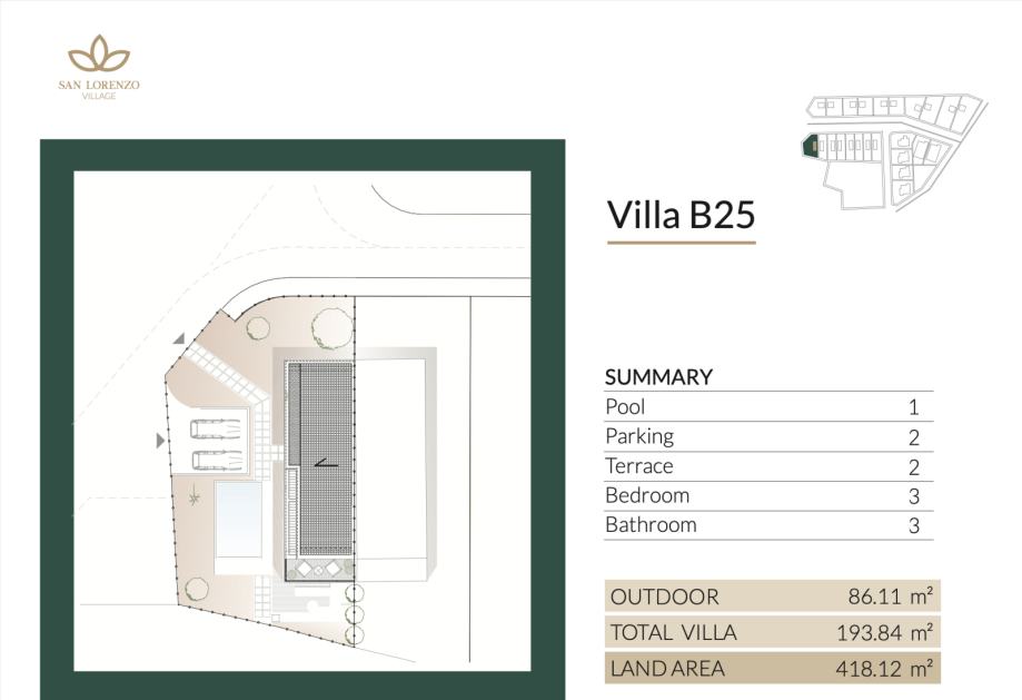 Prodamo vilo etažnosti P+1 s skupno površino 211,95 m2. Pritličje obsega hodnik, dnevno sobo z odprto kuhinjo in jedilnico, kopalnico, utility in teraso z zunanjim bazenom. V prvem nadstropju so tri spalnice z izhodom na lastno teraso ter dve kopalnici. Vili pripadata dve parkirni mesti v skupni velikosti 39 m2.