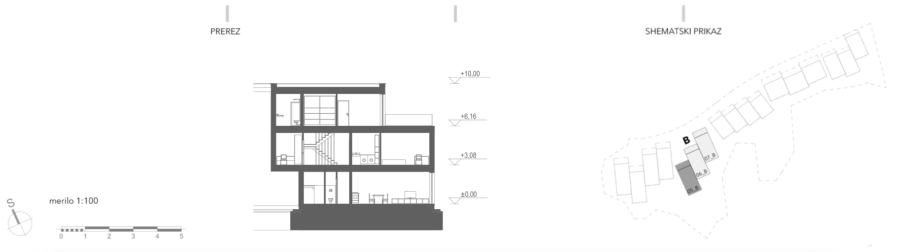 Hiša je orientirana v smeri SZ-JV, vsi bivalni prostori so orientirani na sončno južno stran. Funkcionalna tlorisna razporeditev obsega v pritličju vhodni prostor s stopniščem, shrambo, dnevni WC ter bivalni prostor s kuhinjo in jedilnico in izhodom na ograjeno zelenico. V nadstropju se nahajajo hodnik, dve sobi, utility prostor, kopalnica in kabinet. Zadnja, terasna etaža, obsega zakonsko spalnico, walk-in garderobo, kopalnico, kabinet / savno ter prostorno teraso, na kateri je možno vgraditi masažni bazen.
