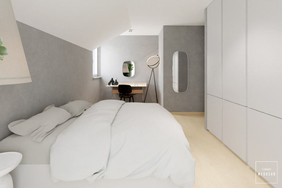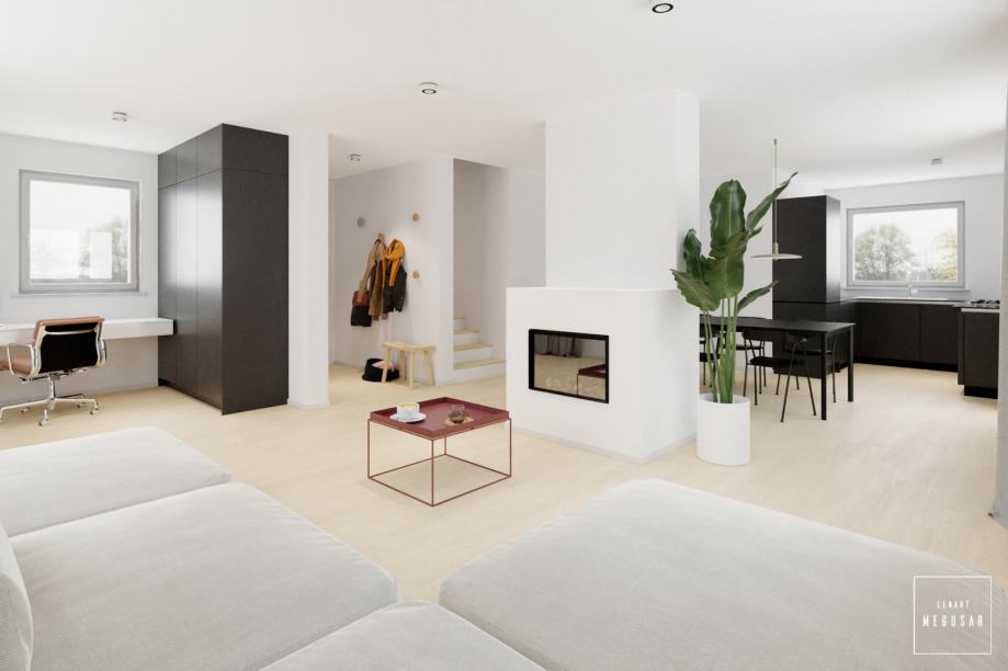 Hiša je zasnovana funkcionalno in svetlo, razprostira se v dveh etažah. V pritličju se nahajajo predsoba, tehnični prostor, shramba, kopalnica ter prostoren dnevni prostor s kuhinjo in jedilnico, iz katerega je izhod na atrij, kjer si lahko uredite prijeten kotiček za sprostitev. Možna je tudi postavitev kamina, ki bo poskrbel za dodatno toplino doma. V mansardi so predvidene tri sobe in velika kopalnica, kar zagotavlja udobje celotni družini.
