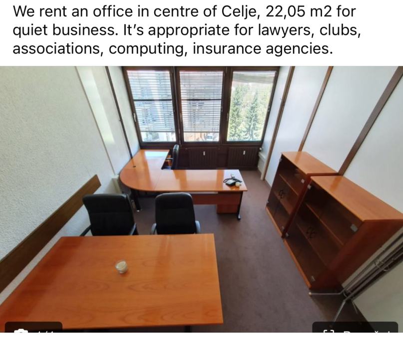 Oddamo poslovni prostor, pisarno, za mirno dejavnost. Primerna je za računovodstvo, odvetnisko pisarno, računalniško in grafiično oblikovanje, zavarovalniške agencije, klube, društva in podobno.