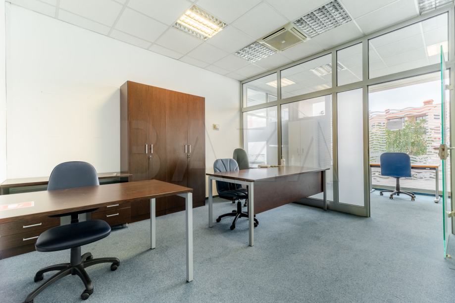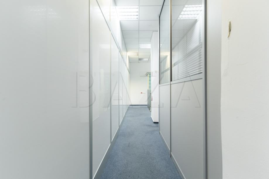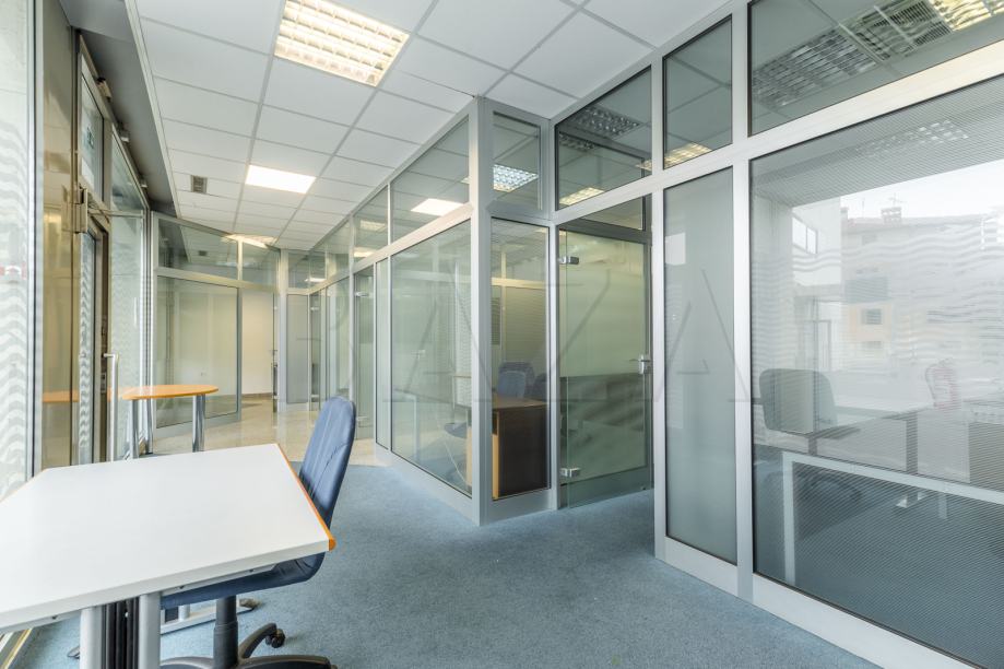Pisarniški del obega 114,90 m2 in ima velika izložbena okna. Prostor je pregrajen z mobilnimi stenami, ki se lahko spreminjajo, glede na potrebe bodočega najemnika. Vhod v prostor je možen iz sprednje in zadnje strani zgradbe. V kletnih prostorih velikosti 67,80 m2 so ločene sanitarije, kuhinja ter skladišče.