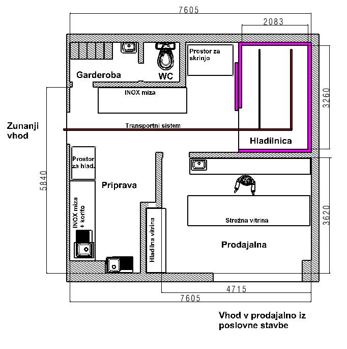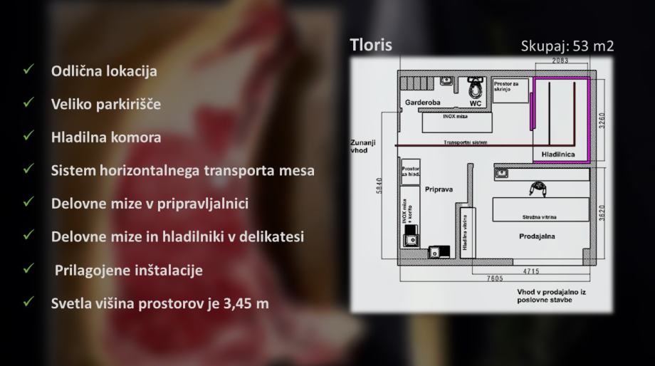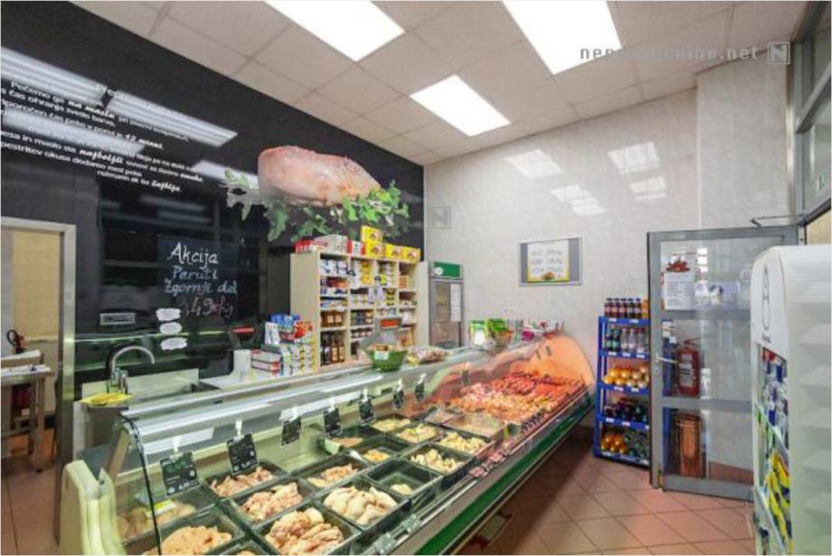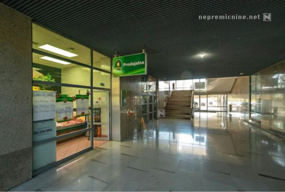 Pritličje je namenjeno trgovski dejavnosti, ostale etaže so večinoma namenjene pisarniški oz. poslovni dejavnosti različnih namembnosti. Lokal je sestavljen iz glavnega osrednjega prostora, kjer je prodajalna, pomožnega prostora za sprejem in skladiščenje mesa, hladilne komore, predprostora in sanitarij. Vse inštalacije so prilagojene namenski rabi prostorov, izveden je tudi sistem horizontalnega transporta mesa. Svetla višina prostorov je 3,45 m, v sanitarijah pa 2,55 m. Neto tlorisna površina obravnavanega prostora je 55,69 m2.