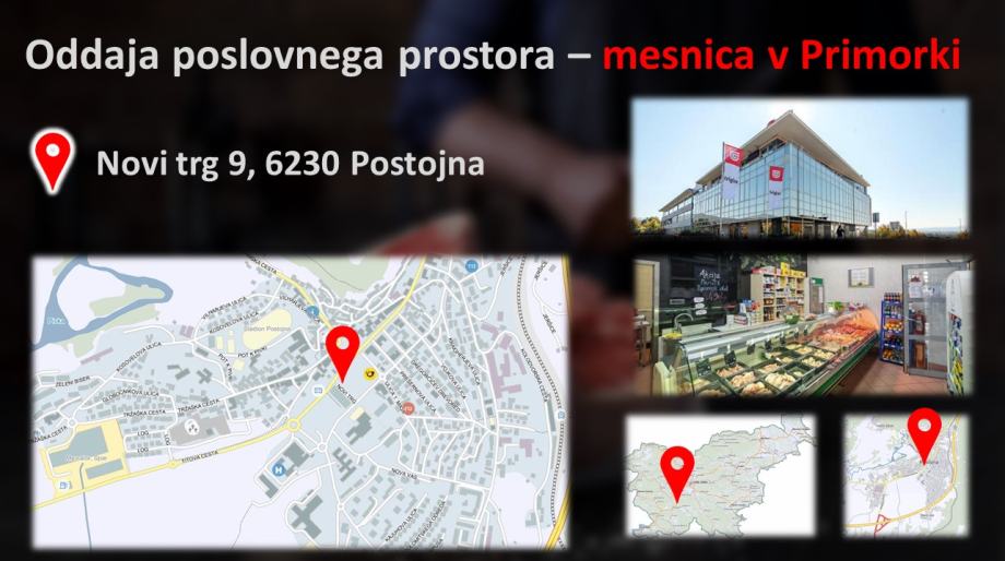 Oddamo poslovni prostor v Postojni. Maloprodajna enota se nahaja v trgovsko poslovnem centru »Primorka«, v centru mesta Postojna. V neposredni okolici so pomembne državne institucije kot so osnovna šola, vrtec, glavna avtobusna postaja, zdravstveni dom.