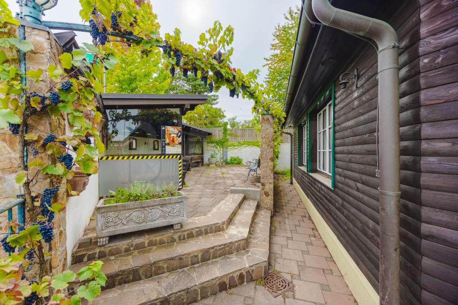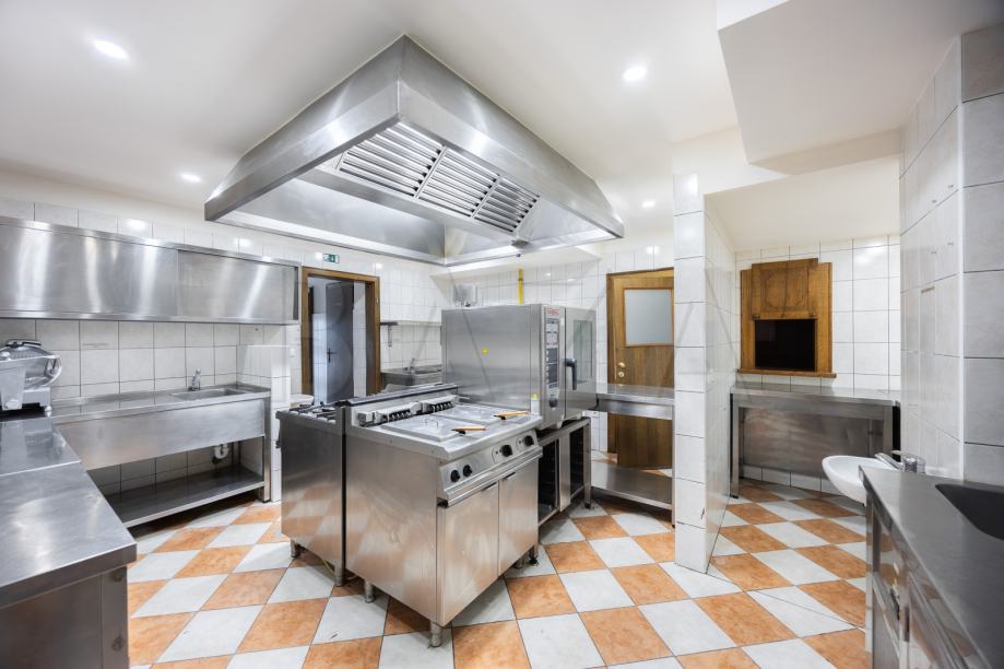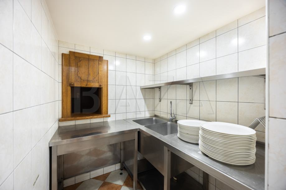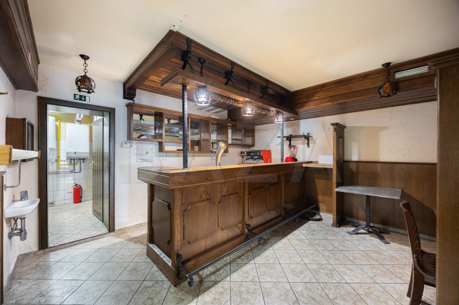 Gostinski lokal se nahaja v pritličju. Tlorisna zasnova obsega prostorno jedilnico z mizami in točilnim pultom, profesionalno opremljeno kuhinjo (dodatno vgrajena šamotna peč za pizze ali drugo peko) z vrhunskim prezračevalnim sistemom ter dodatne pomožne prostore. Omogočena je tudi uporaba prijetnega zasebnega letnega vrta, ki je prav tako opremljen z mizami.