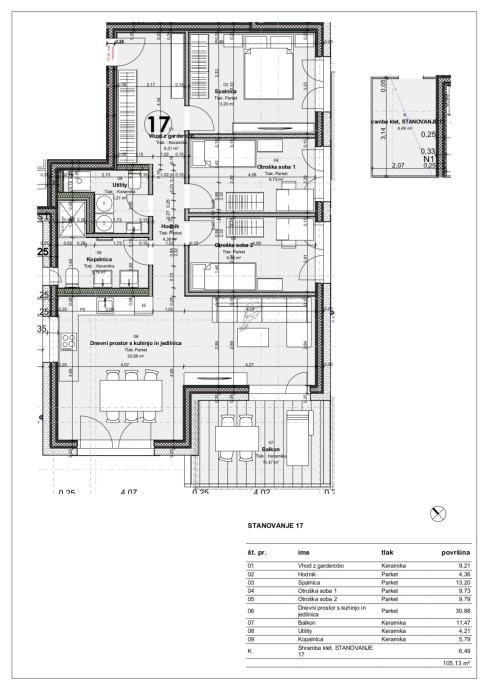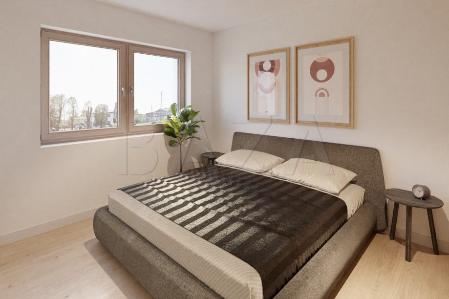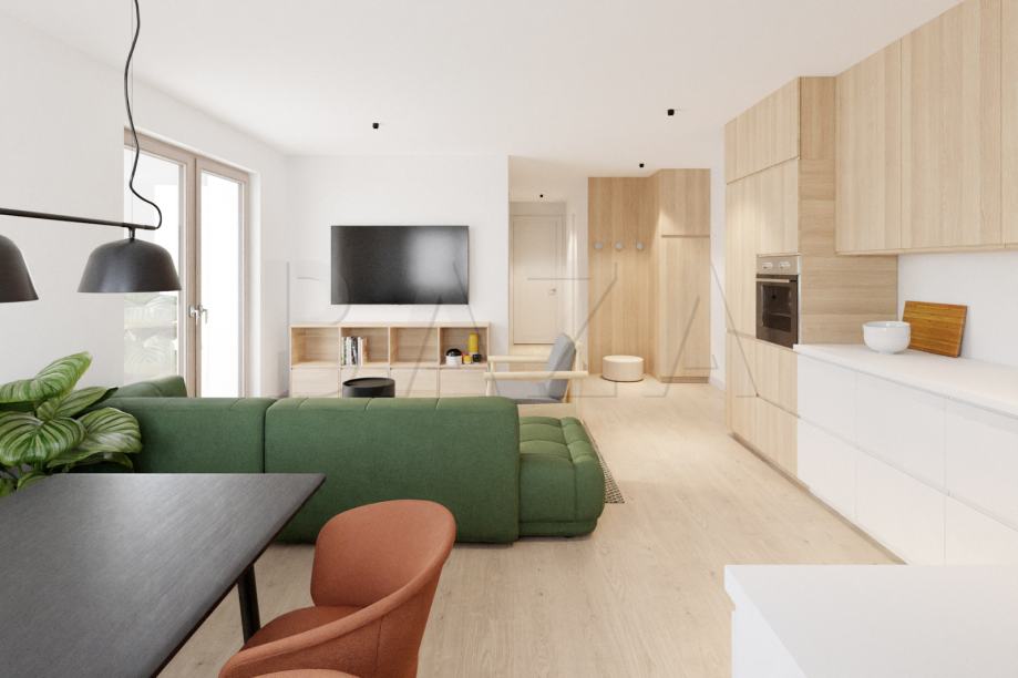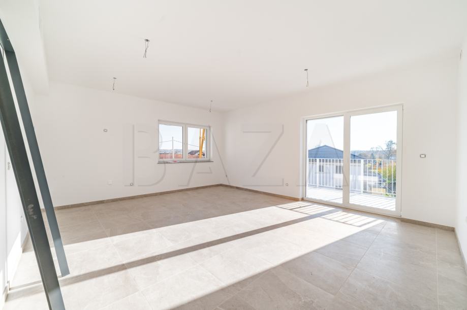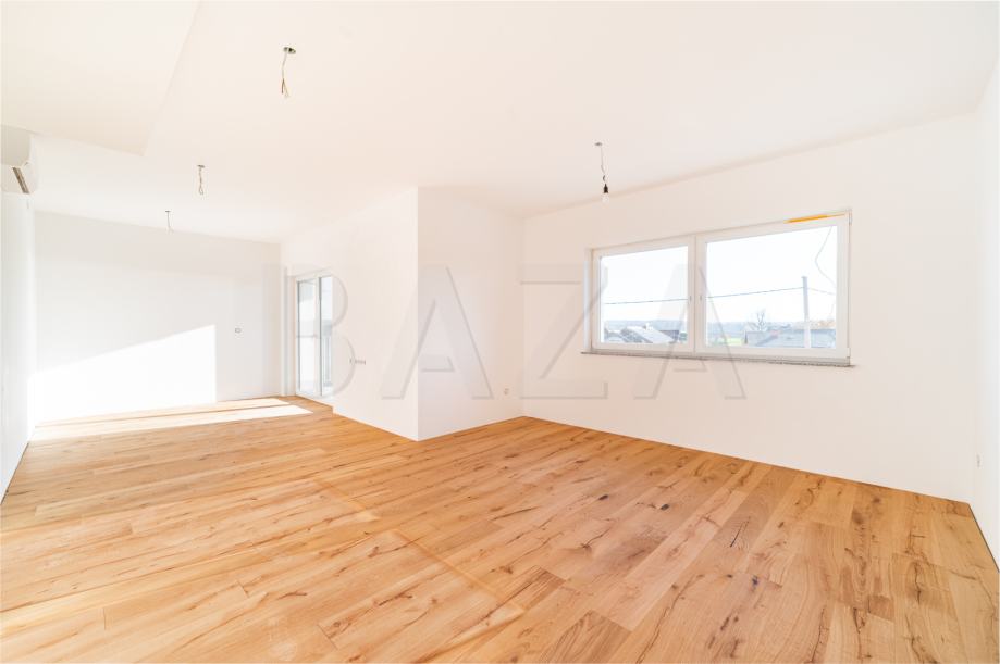 Tlorisna zasnova nudi funkcionalno razporeditev z veliko udobja in naravne svetlobe, ter obsega dnevni prostor s kuhinjo in jedilnico z izhodom na balkon, kopalnico, utility, spalnico ter dve otroški sobi. Oprema v kopalnici je priznane znamke vrhunske kvalitete – Villery Boch, Geberit.