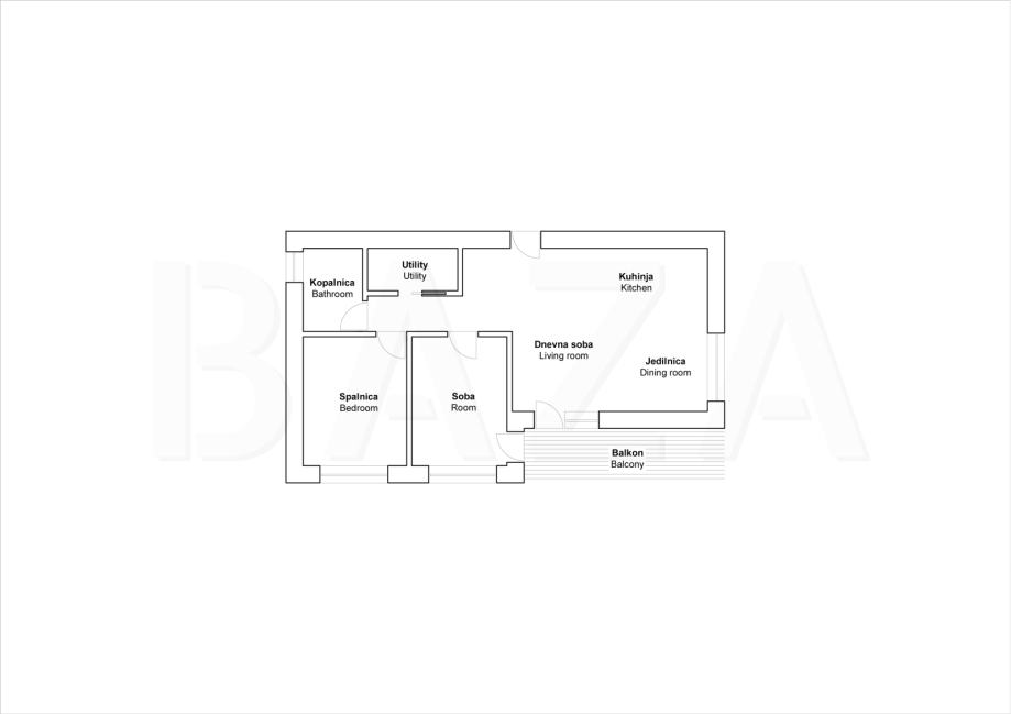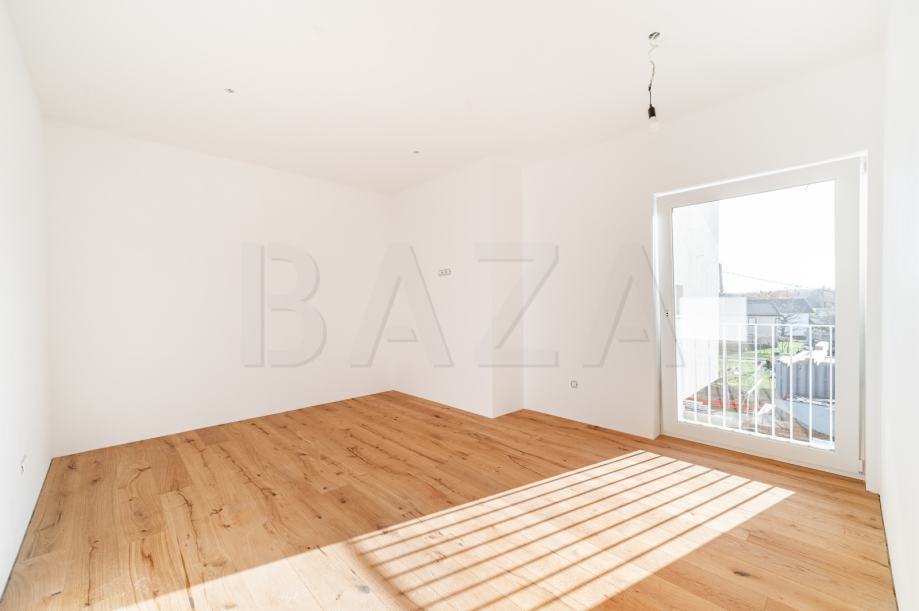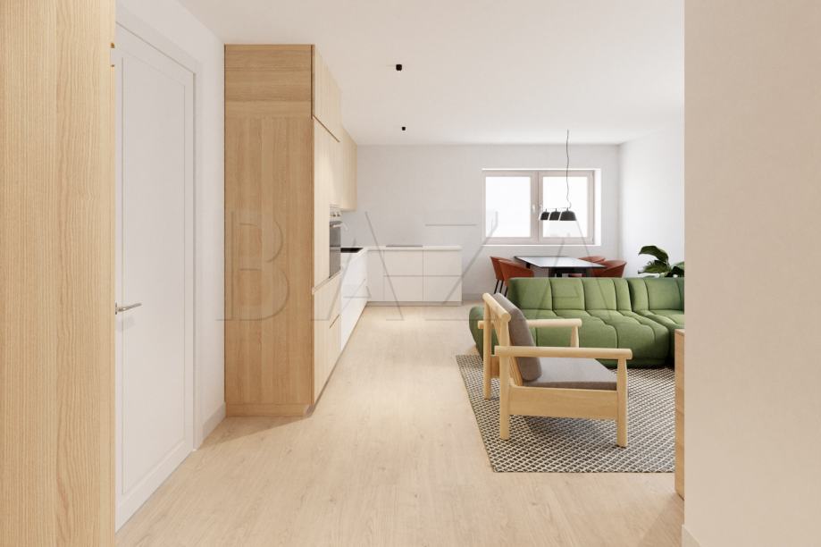 Tlorisna zasnova nudi funkcionalno razporeditev z veliko udobja in naravne svetlobe, ter obsega dnevni prostor s kuhinjo in jedilnico z izhodom na balkon, kopalnico, utility, spalnico ter otroško sobo. Oprema v kopalnici je priznane znamke vrhunske kvalitete – Villery Boch, Geberit.