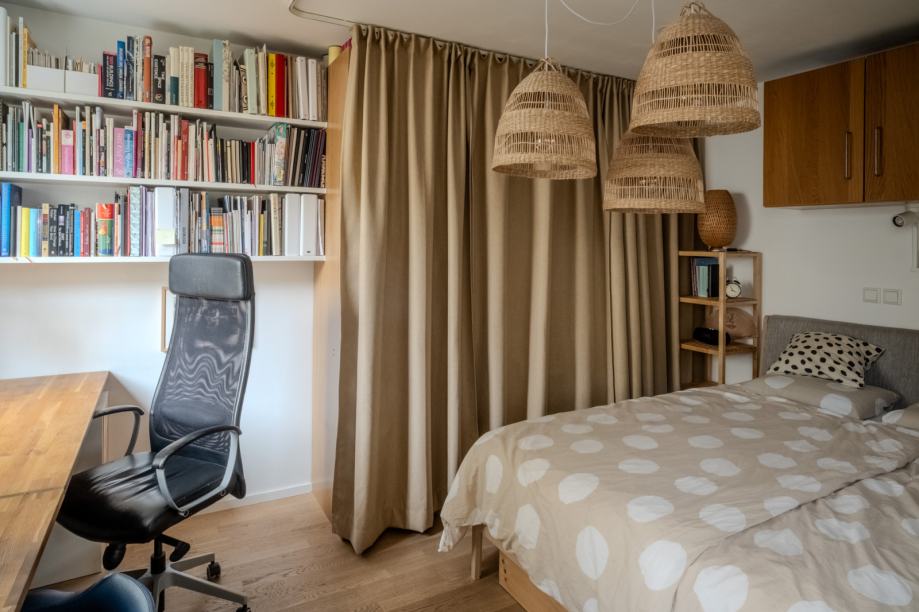 Stanovanje ponuja prostorno dnevno sobo, spalnico ter sodobno opremljeno kopalnico (prenovljeno leta 2022). Med spalnico in dnevno sobo so široka drsna vrata, ki ob odprtju ustvarijo občutek večje, bolj povezane bivalne površine. Spalnica je dodatno prilagojena za uporabo kot domača pisarna, saj jo je s pomočjo zavese možno enostavno razdeliti na dva ločena prostora. Delovna površina z dvema pisalnima mizama (vsaka širine 140 cm) omogoča udobno delo od doma. Balkon velikosti 4 m² predstavlja idealen kotiček za jutranjo kavo ali sproščujoče večere na prostem.