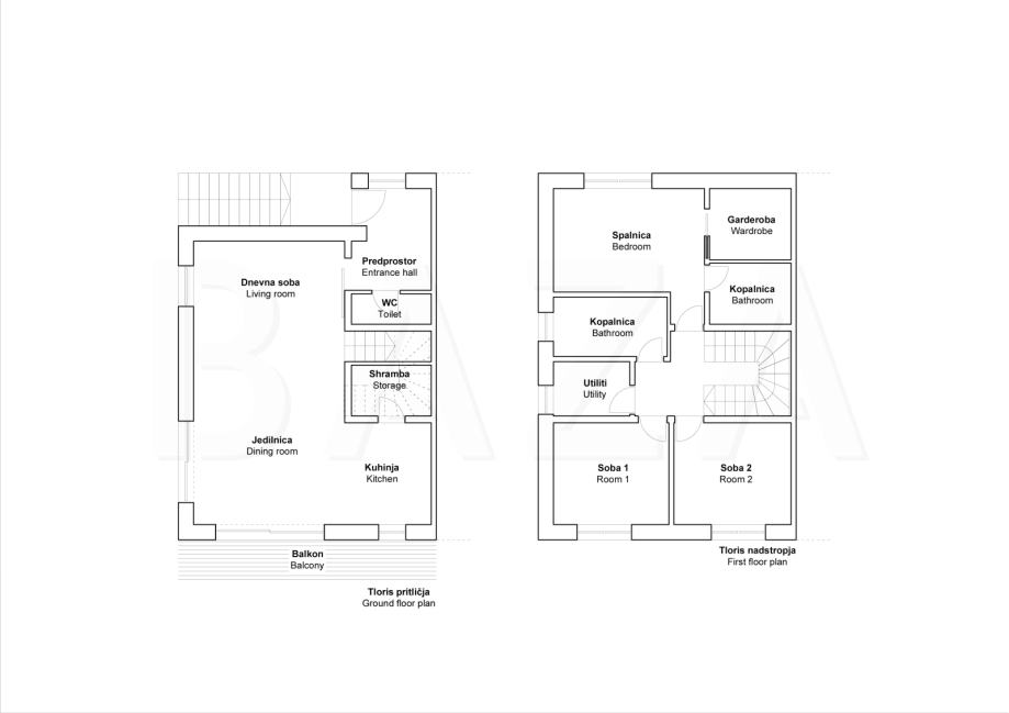 Stanovanje je orientirano v smeri Z-V in obsega pritličje in nadstropje. V pritličju se nahaja vetrolov, dnevni WC, shramba, bivalni prostor s kuhinjo in jedilnico ter balkon. V nadstropju se nahaja utility, kopalnica, dve otroški sobi ter zakonska spalnica z lastno kopalnico in garderobno sobo.