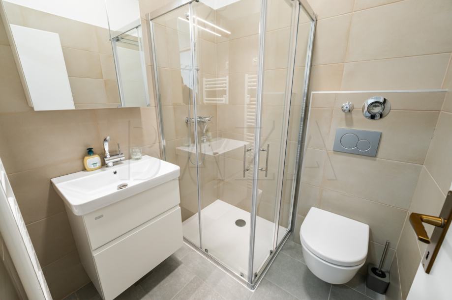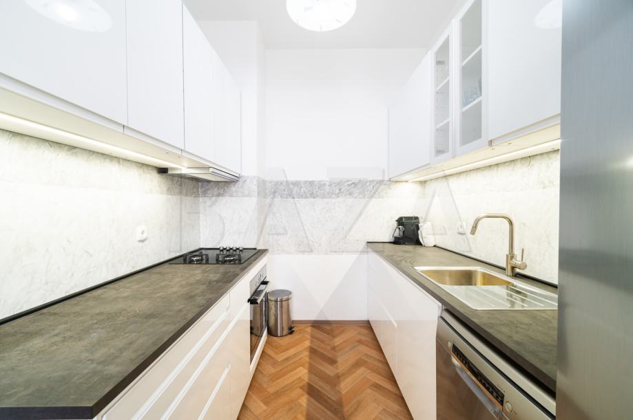 Tlorisna zasnova obsega dnevno sobo z zastekljenim balkonom, ločeno kuhinjo, spalnico in kopalnico. Stanovanje je bilo pravkar celovito prenovljeno in ima popolnoma nove aparate in pohištvo. Kuhinja je polno opremljena (pomivalni stroj, pečica, kuhalnik na plin in elektriko, napa, hladilnik, zamrzovalnik in nekaj kuhinjske posode). V stanovanju se nahaja optika, pralni stroj in domofon. Stanovanje odlikujejo stropovi višine tri metre in veliko dnevne svetlobe. Ogrevanje je centralno na toplovod. Skupni mesečni stroški so relativno nizki. Stanovanju pripada eno parkirno mesto za rampo in kletna shramba. Stavba ima skupno kolesarnico.