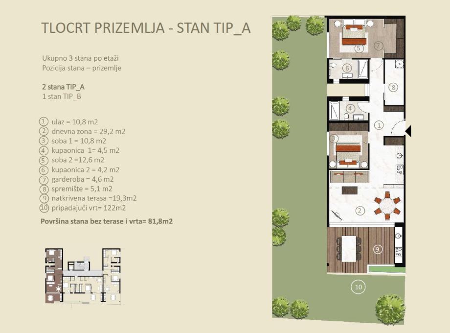 Stanovanje se nahaja v pritličju nove stavbe z osmimi stanovanjskimi enotami. Tlorisna zasnova znaša 86,90 m2 in obsega hodnik, dnevno sobo z odprto kuhinjo in jedilnico, spalnico, otroško sobo, kopalnico, garderobno sobo, shrambo teraso v velikosti 16,30 m2 ter vrt v velikosti 122,00 m2. Stanovanju pripada parkirno mesto v velikosti 12,50 m2, s predpripravo za električno polnilnico.