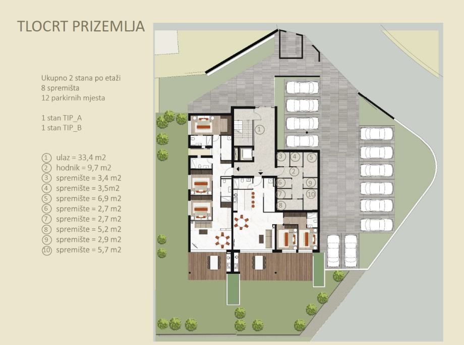 Stanovanje se nahaja v pritličju nove stavbe z osmimi stanovanjskimi enotami. Tlorisna zasnova znaša 102 m2 in obsega: hodnik, dnevno sobo z odprto kuhinjo in jedilnico, spalnico, dve sobi, kopalnico, garderobno sobo, shrambo v velikosti 3,50 m2, teraso v velikosti 23,20 m2 in vrt v velikosti 186,30 m2. Stanovanju pripadata dve parkirni mesti v skupni velikosti 25 m2, s predpripravo za električno polnilnico.