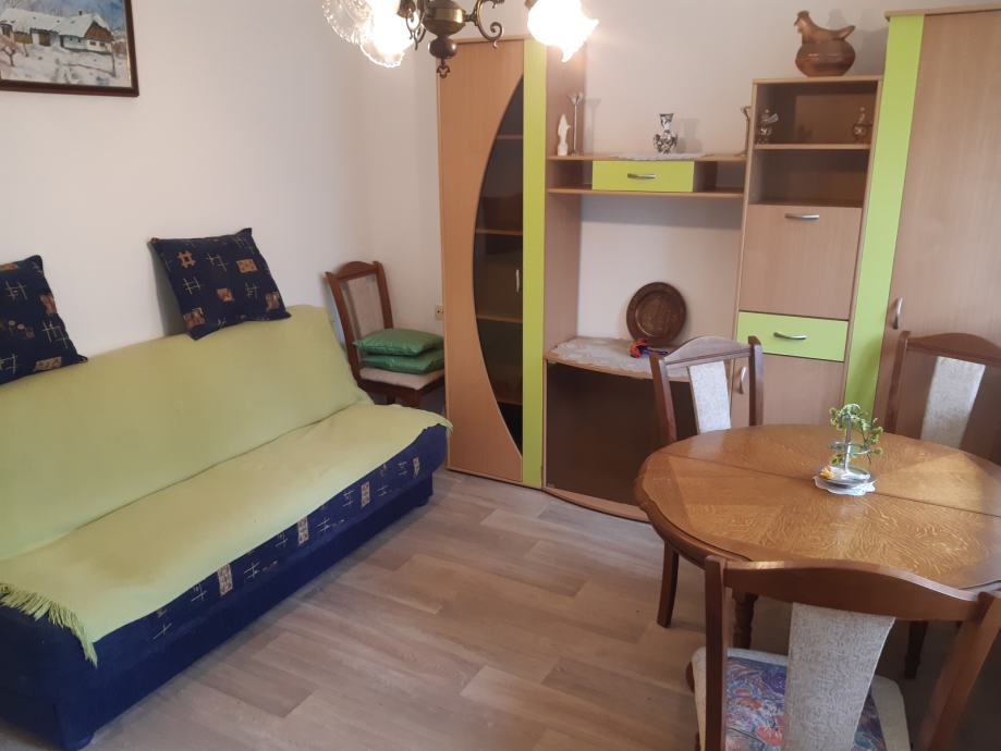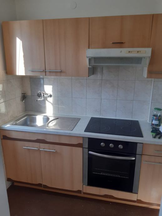manjša kuhinja z prehodom v dnevno sobo z jedilnico,