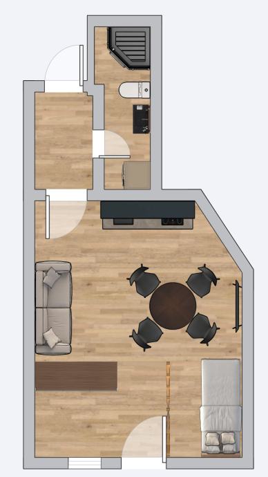 Med slikami je prikazan predlog postavitve pohištva v garsonjeri za lažjo predstavo.