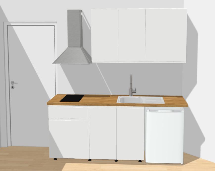 - vstopa se v večji prostor, v katerem so pripravljeni vsi priključki za postavitev kuhinje ter ostalega pohištva (sedežna, postelja, garderobna omara),