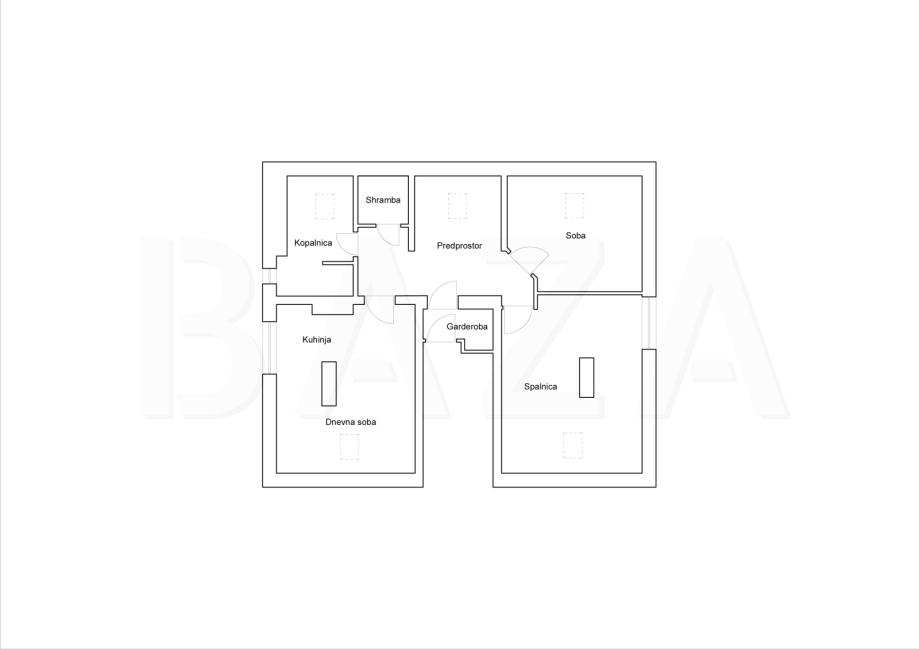 Stanovanje ima funkcionalno zasnovo in obsega celotno zgornjo etažo. Tloris obsega vetrolov, kuhinjo z jedilnico in dnevno sobo, kopalnico, shrambo, dve spalnici ter predsobo, ki lahko služi kot pisarna oz. čitalnica. Možna je pregraditev večje spalnice v dva kabineta.